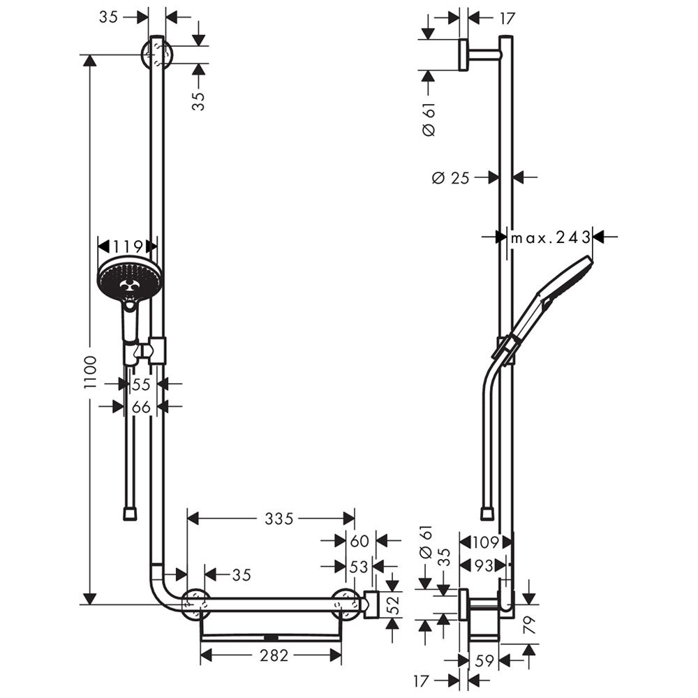 - Besteht aus: Handbrause, Brausestange, Ablagekorb, Brauseschlauch, Schieber