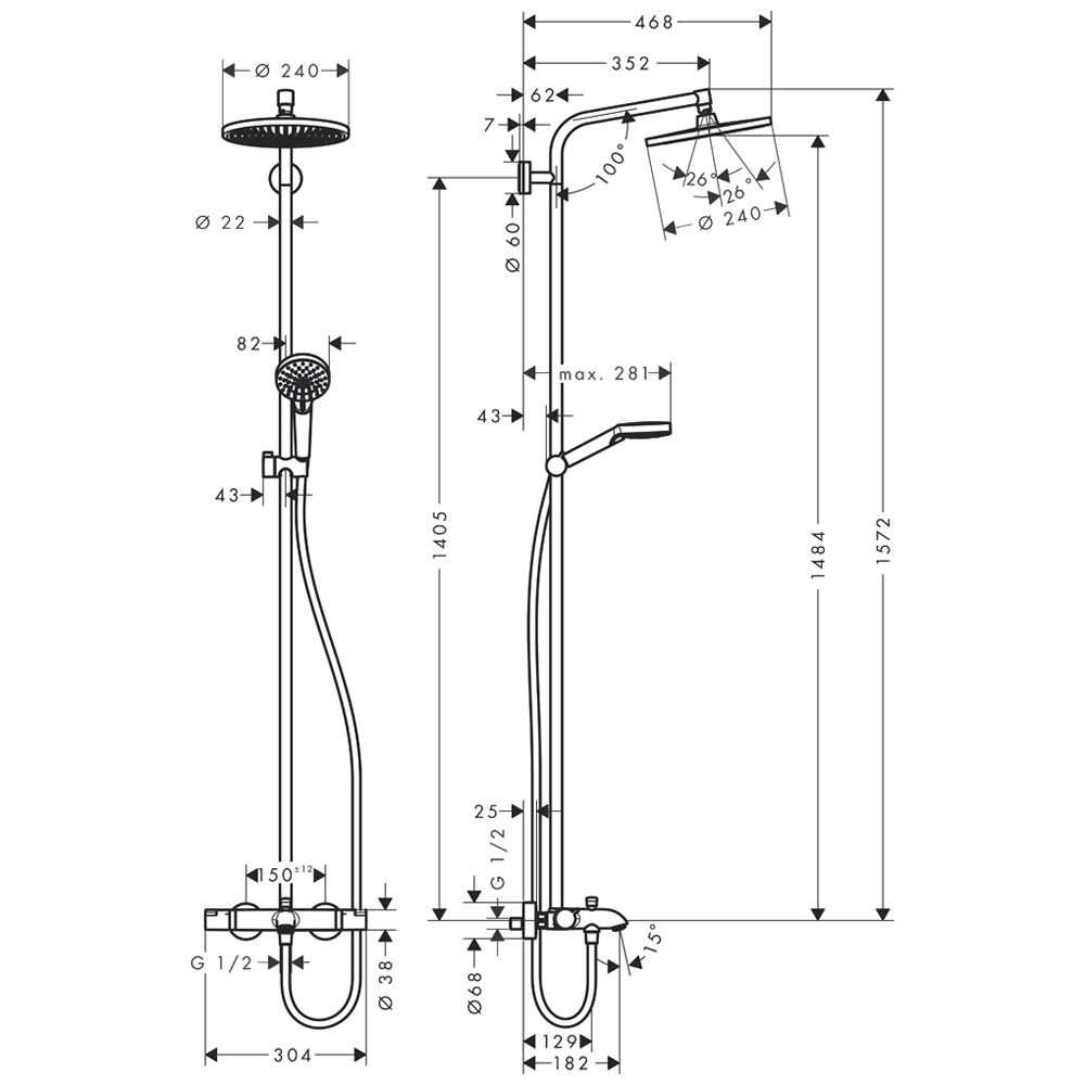 - Besteht aus: Kopfbrause, Handbrause, Wannenthermostat, Brauseschlauch, Schieber