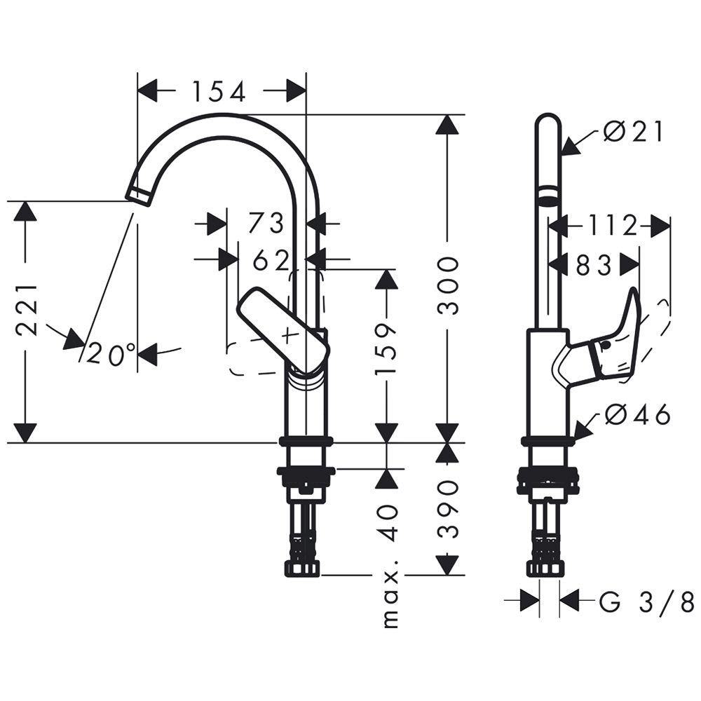 - einfach installiert: die Armatur wird über flexible Schläuche (G 3/8") mit den Wasseranschlüssen verbunden