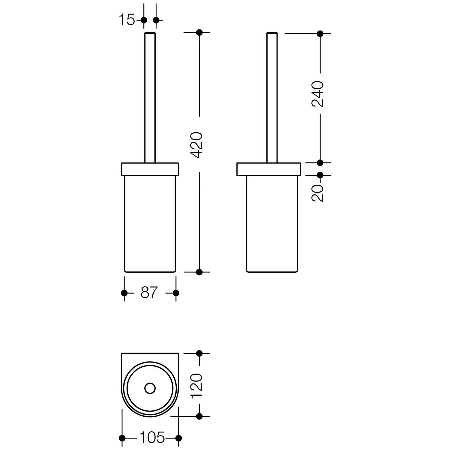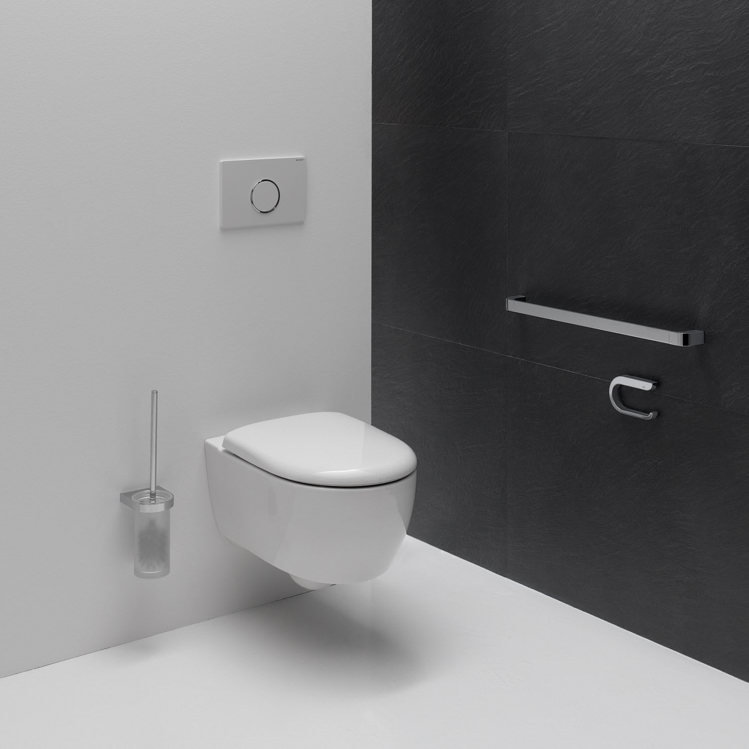 - ringförmiger Wandhalter mit Schutzring aus Kunststoff für eine sichere, definierte Position und gegen Beschädigungen des Bürstenbehälters