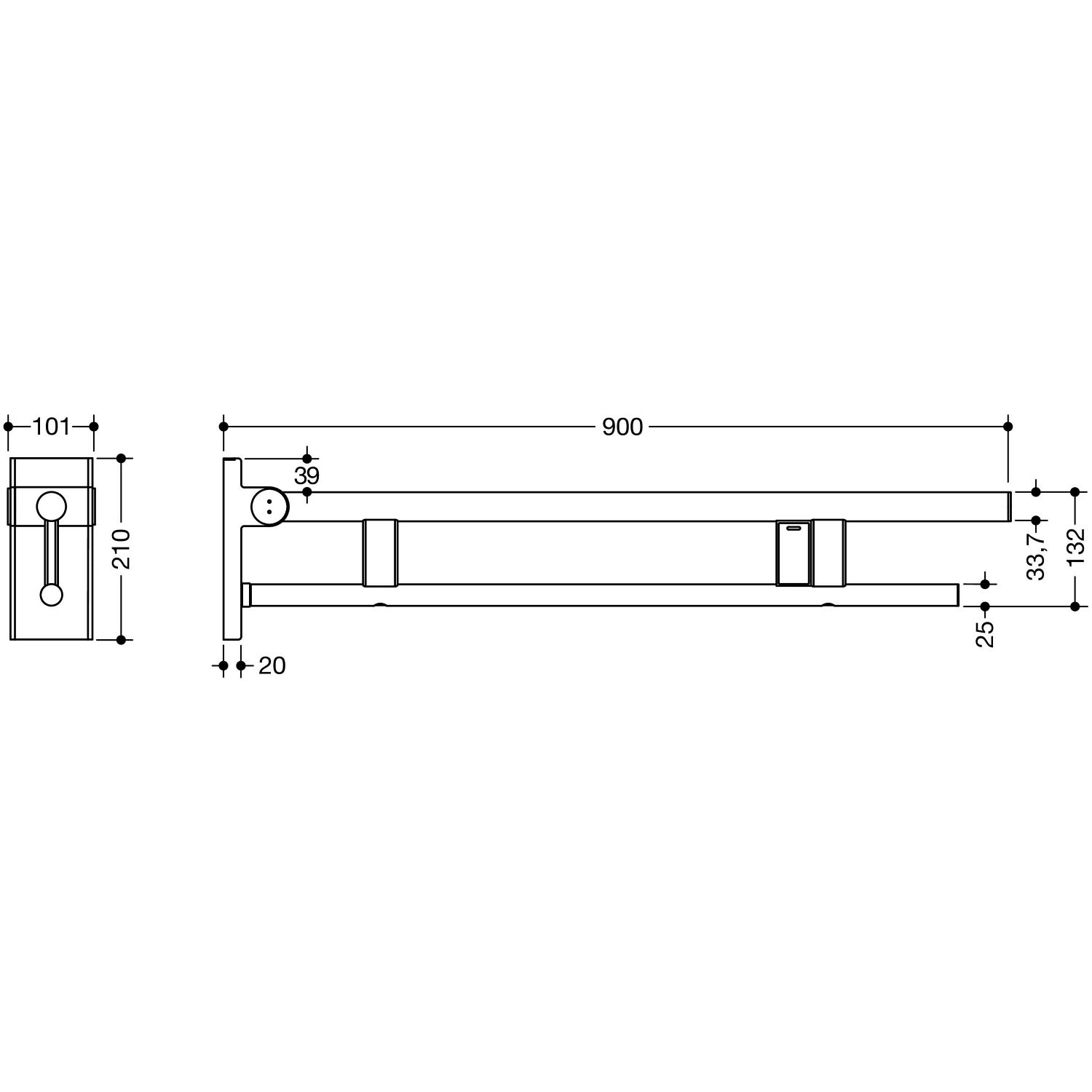 Die Stützklappgriffe von System 900 verfügen über eine wartungsfreie Bremse. Diese dämpft das Absenken des Stützklappgriffs. Der Holm lässt sich mit geringem Kraftaufwand nach oben und unten bewegen. Ist der Winkel größer als 45 °, verweilt der Stützklappgriff in jeder beliebigen Position und kann mit geringer Kraft abgesenkt oder zur Wand geklappt werden. Ab einem Winkel von 45 ° senkt sich der Holm automatisch sanft ab.