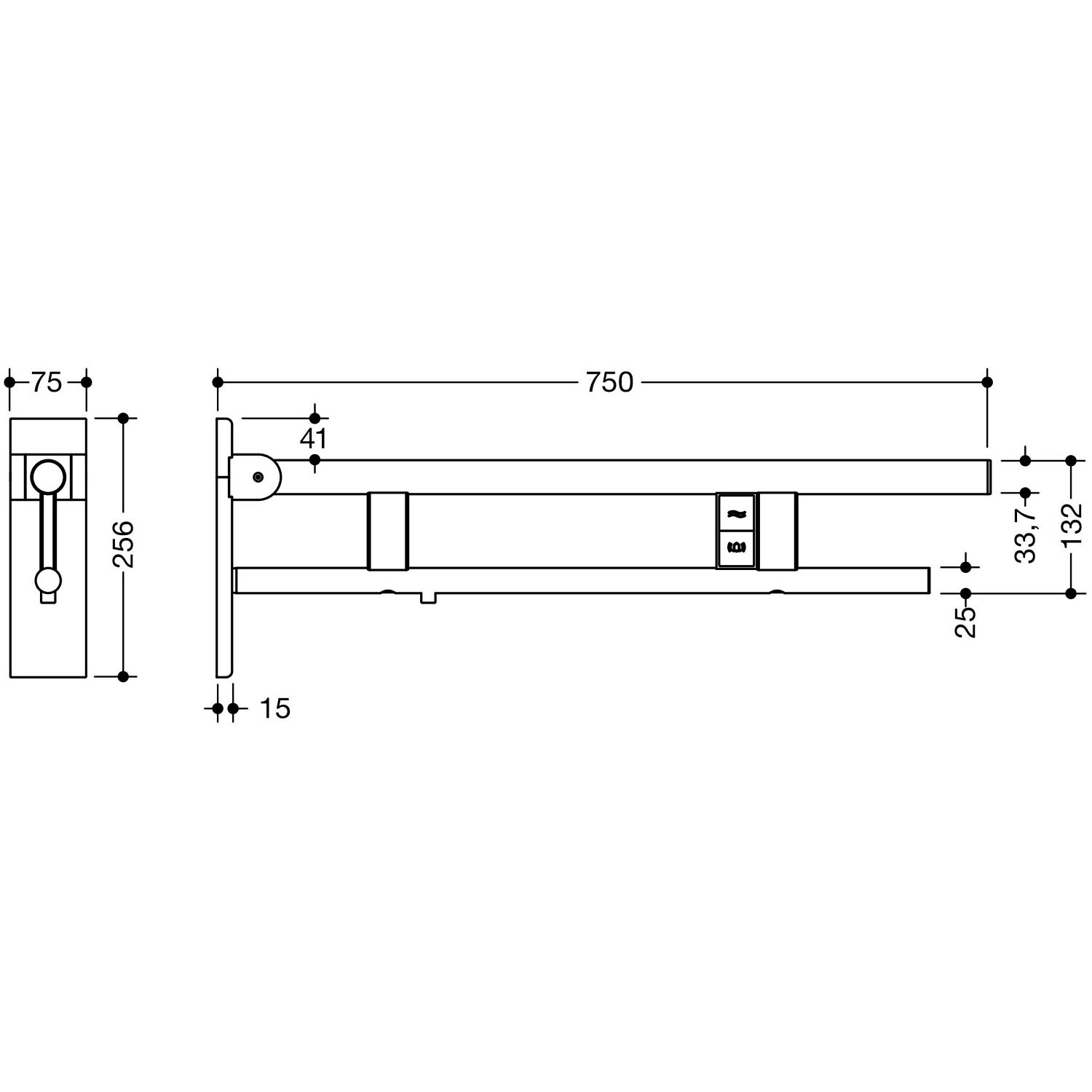 HEWI System 900 Stützklappgriff Duo Design B mit 2 Funktionstasten (E-Ausführung), links 75 cm