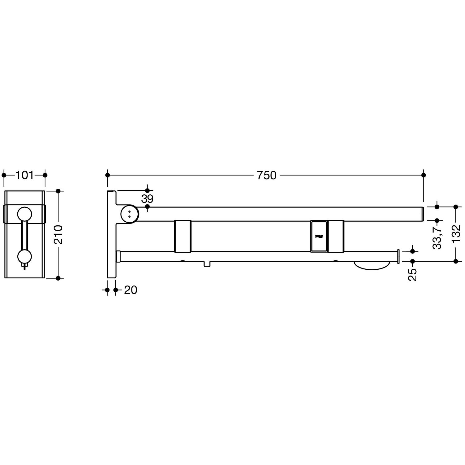 HEWI System 900 Stützklappgriff Duo Design A mit WC-Papierhalter und Spülauslösung (E-Ausfhrg.), li. 75 cm