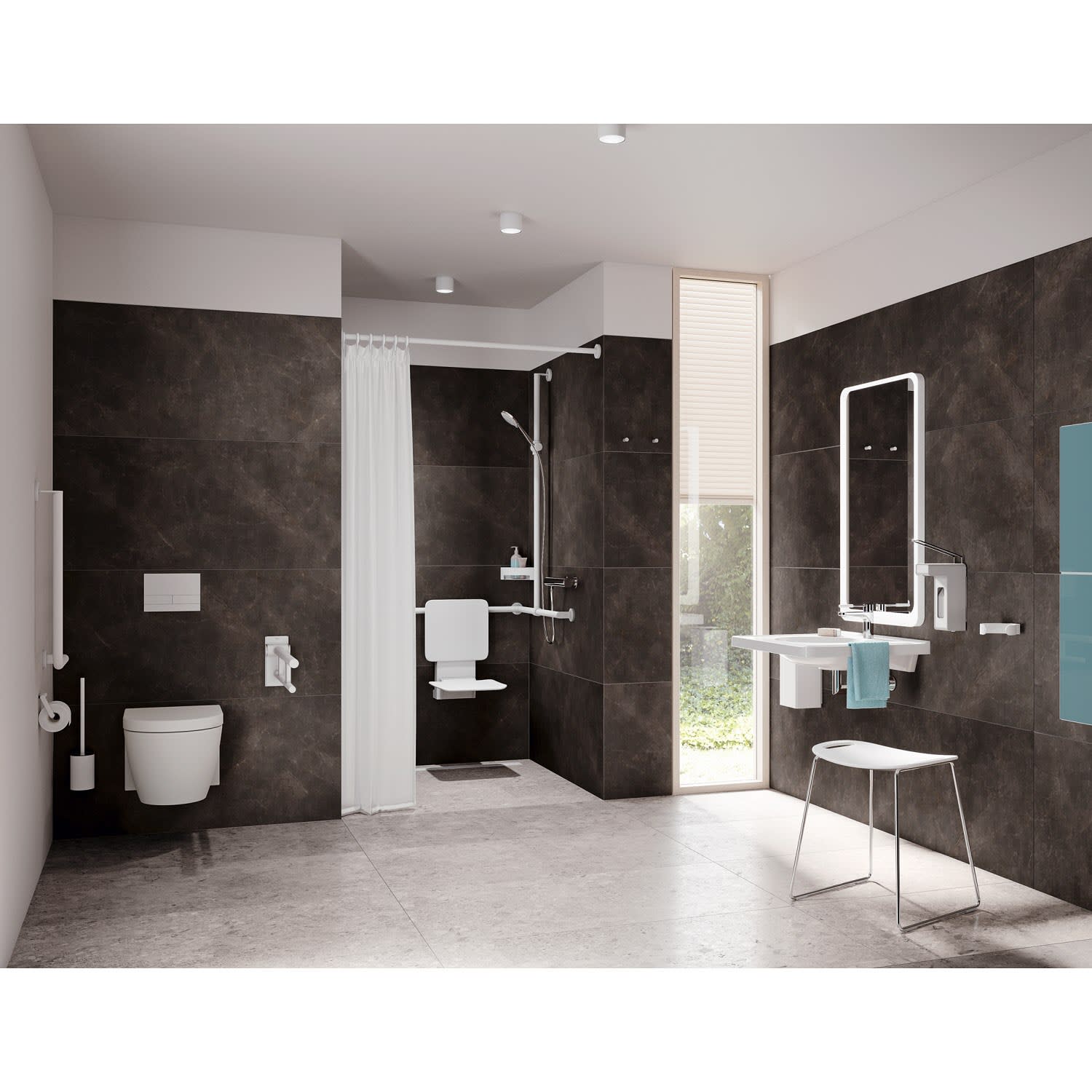 Die Stützklappgriffe von System 900 verfügen über eine wartungsfreie Bremse. Diese dämpft das Absenken des Stützklappgriffs. Der Holm lässt sich mit geringem Kraftaufwand nach oben und unten bewegen. Ist der Winkel größer als 45 °, verweilt der Stützklappgriff in jeder beliebigen Position und kann mit geringer Kraft abgesenkt oder zur Wand geklappt werden. Ab einem Winkel von 45 ° senkt sich der Holm automatisch sanft ab.