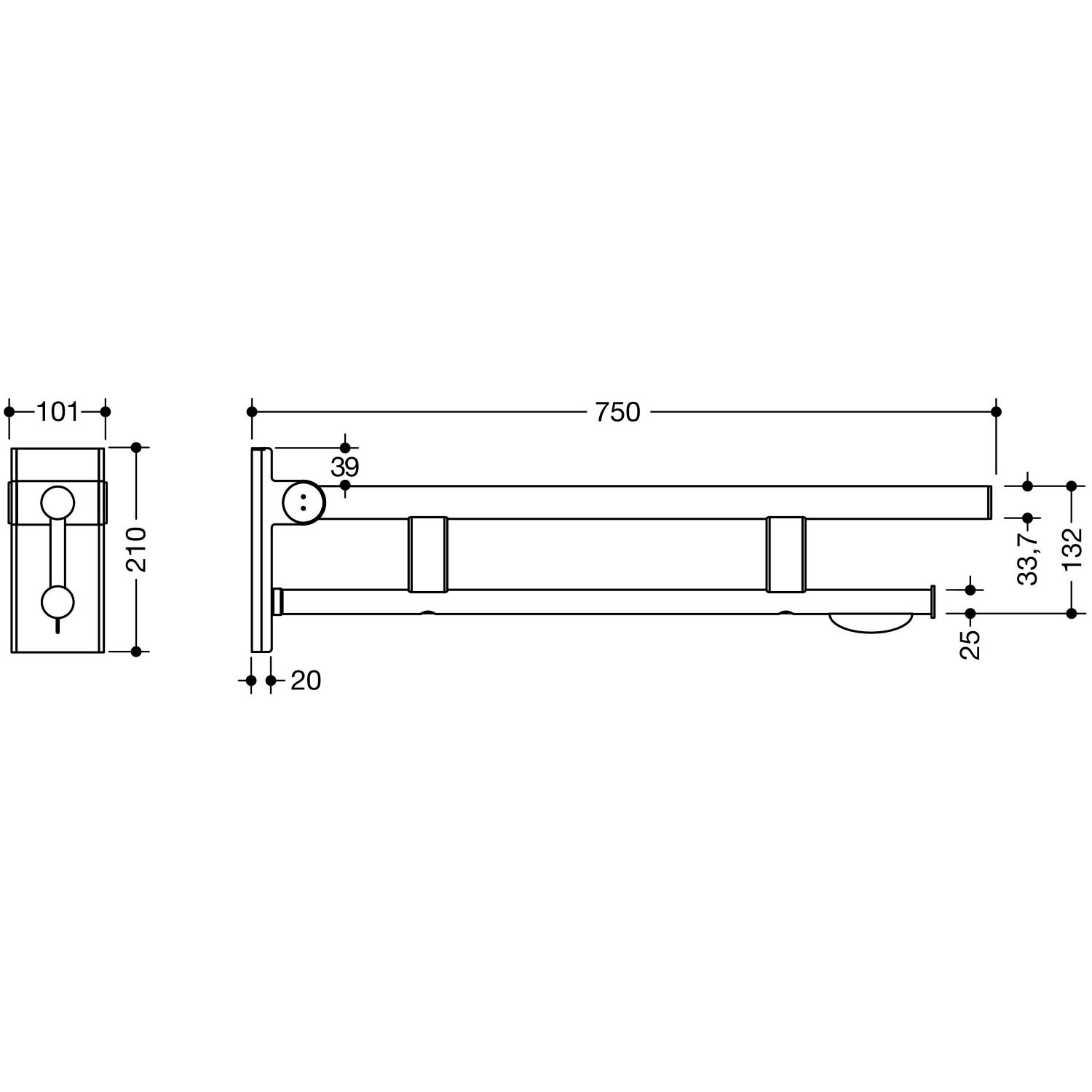 HEWI System 900 Stützklappgriff Duo Design A mit WC-Papierhalter, 75 cm