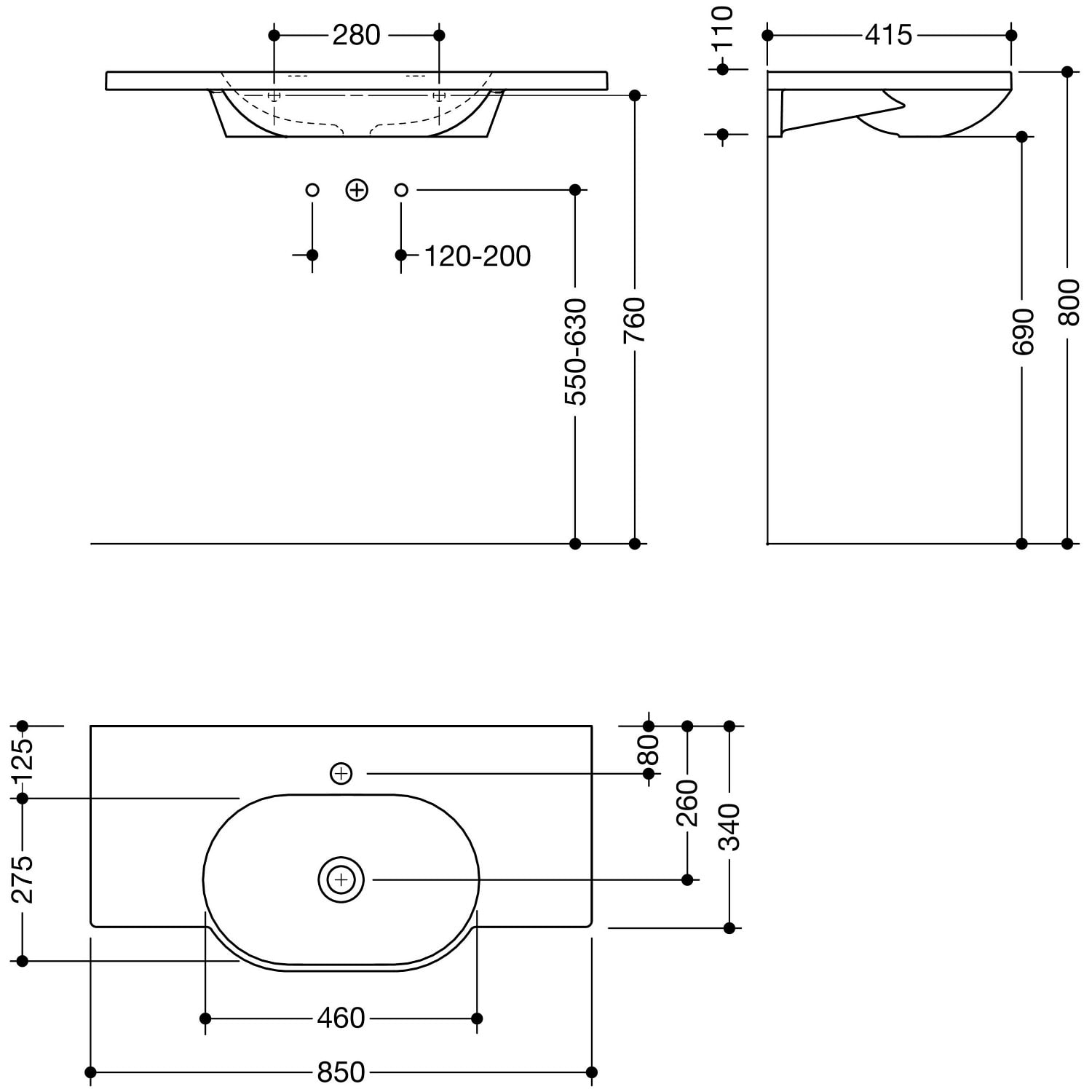 HEWI Universal Waschtisch 85 x 41,5 cm mit 1 Hahnloch, ohne Überlauf
