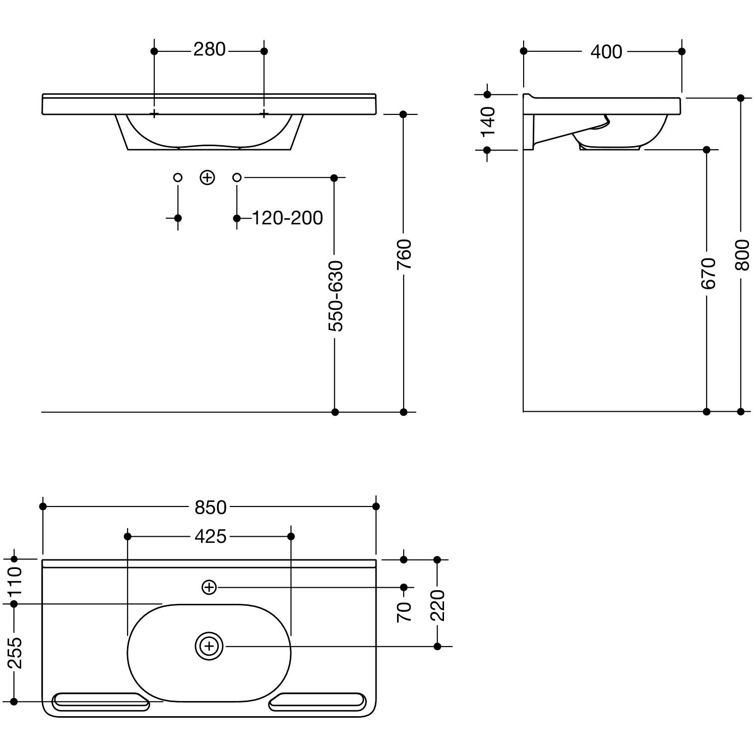 HEWI Universal Waschtisch 85 x 40 cm mit 1 Hahnloch, ohne Überlauf