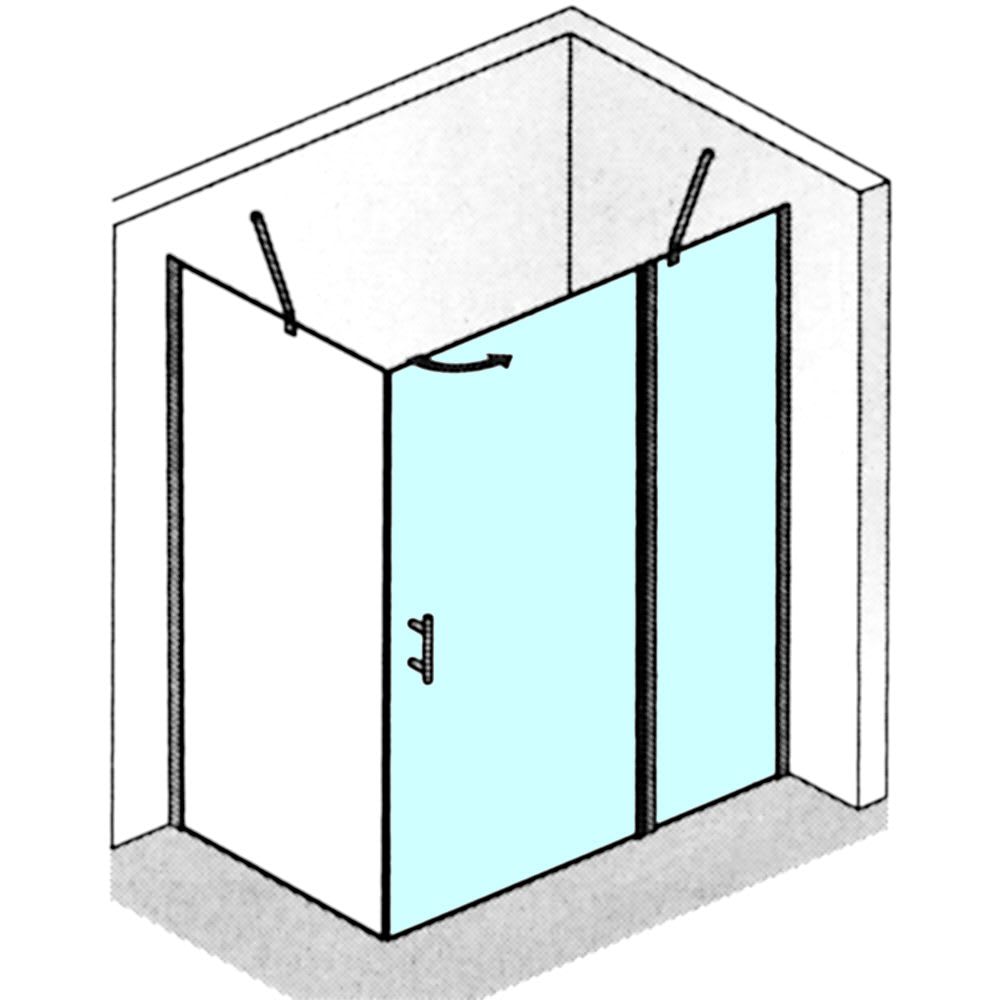 Diese Drehtürlösung verfügt über ein Nebenteil und wird an einer Seitenwand montiert, welche separat dazu bestellt werden muss. Öffnen lässt sich die Tür nach außen.