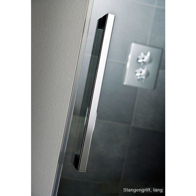 Diese rahmenlose Drehtür ist eine optimale Lösung für die Nische und wird von hochwertigen Pendelbeschlägen gehalten. Diese Variante verfügt über ein schmales Nebenteil, wodurch sie auch in breitere Nischen passt.