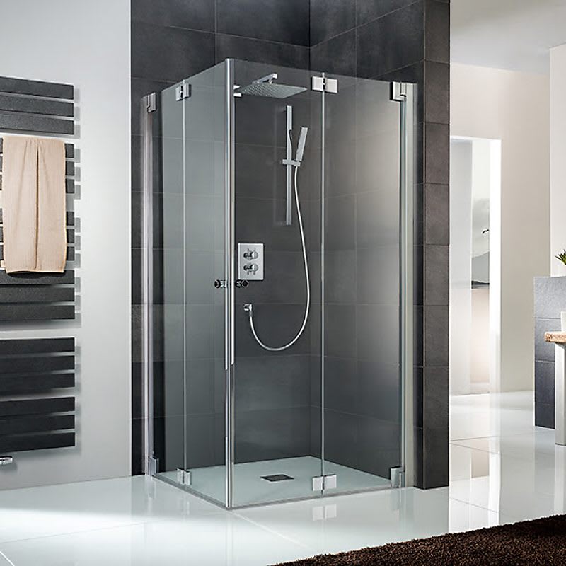 Zwei Drehfalttüren ergeben einen besonders komfortablen Eckeinstieg mit viel Platz. Wenn die Dusche gerade nicht in Benutzung ist, lassen sich die Türen flach an die Wand falten!