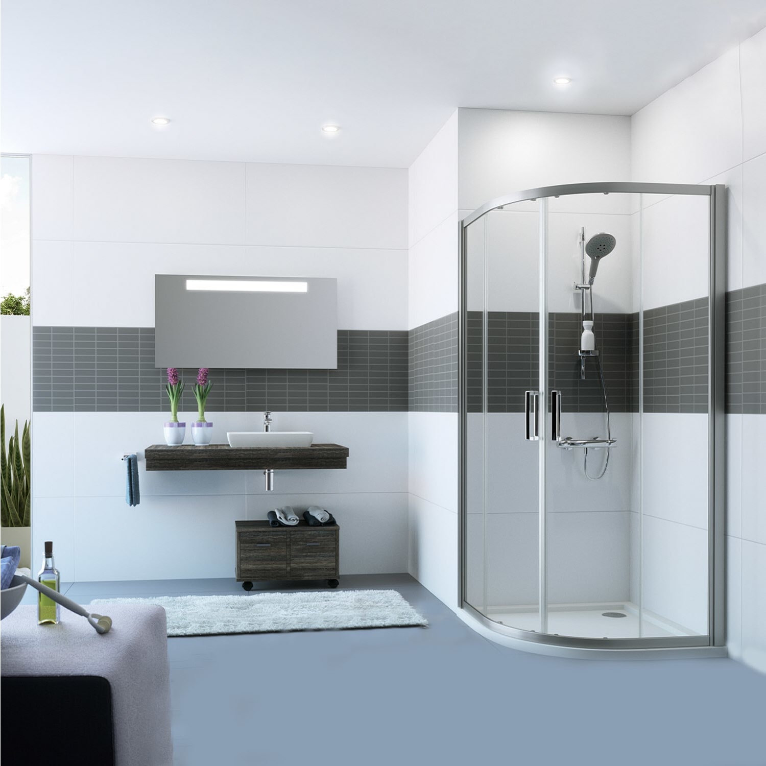 - teilgerahmte Viertelkreis-Duschkabine mit zwei Gleittürsegmenten, je nach einer Seite öffnend und zwei festen Segmenten