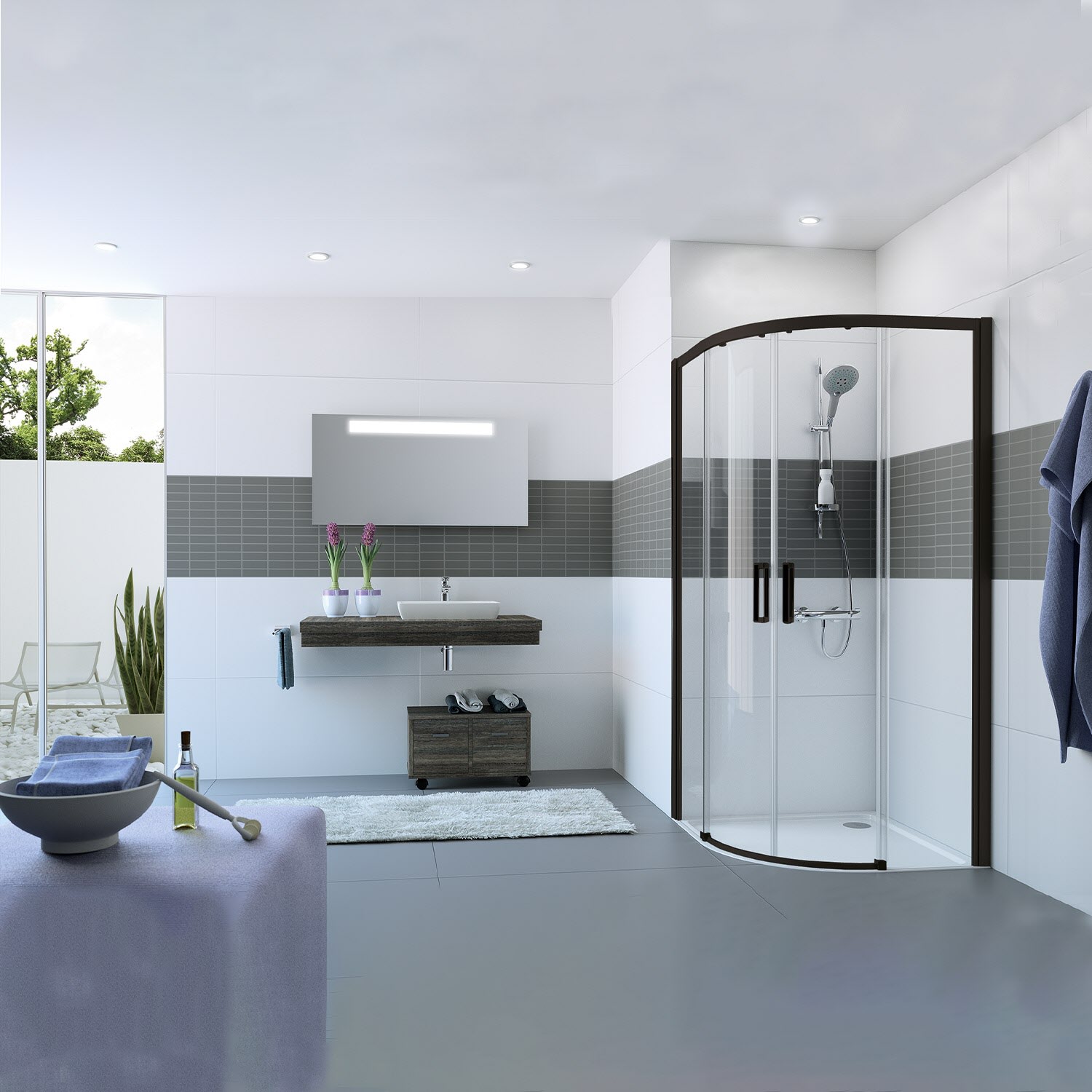 - teilgerahmte Viertelkreis-Duschkabine mit zwei Gleittürsegmenten, je nach einer Seite öffnend und zwei festen Segmenten