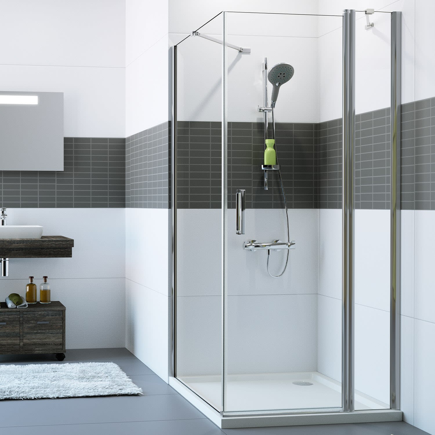 - kombinierbar mit Seitenwand oder Schwingtür mit Festteil gleichen Typs zum Eckeinstieg