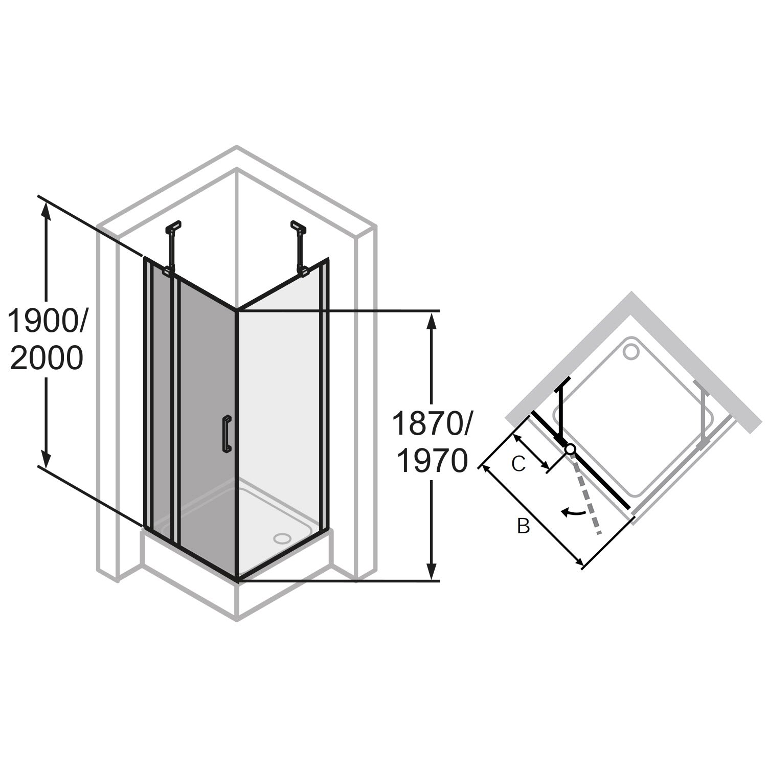 - kombinierbar mit Seitenwand oder Schwingtür mit Festteil gleichen Typs zum Eckeinstieg