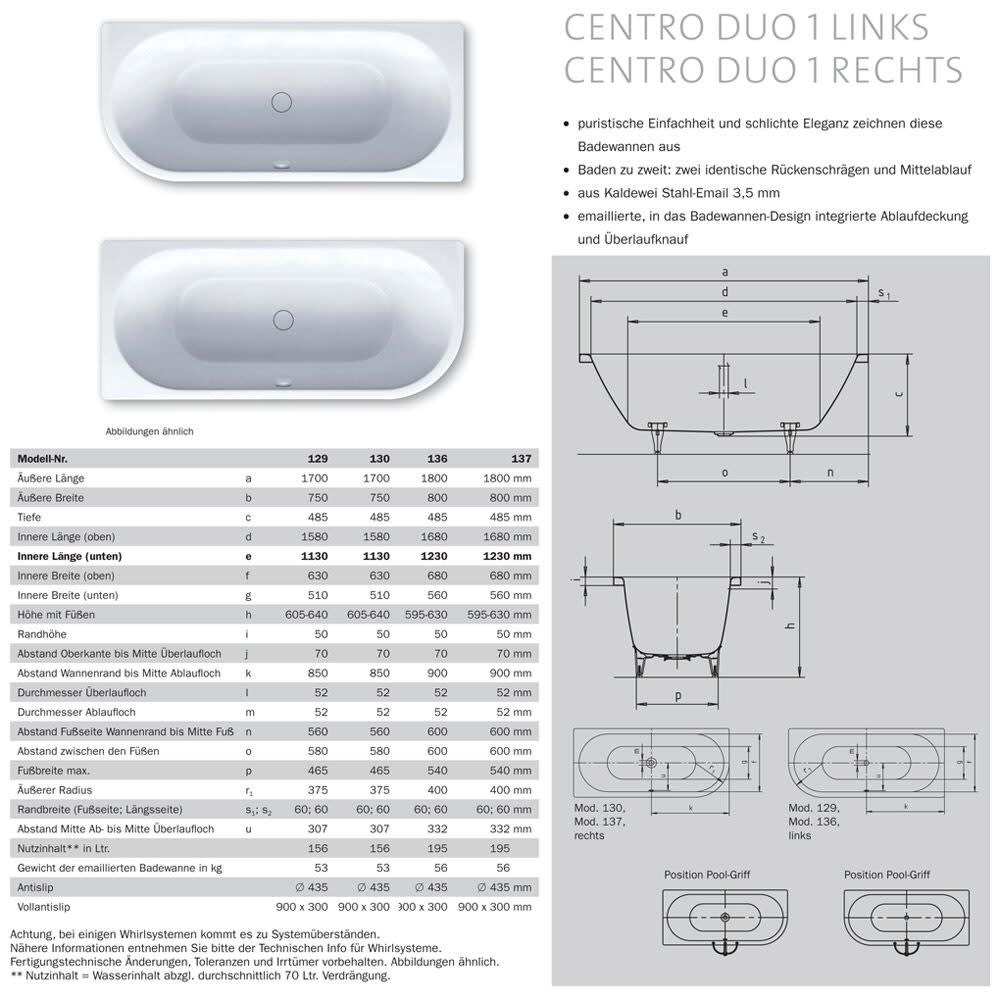 Kaldewei Centro Duo 1 rechts 137 Eckbadewanne 180 x 80 cm mit Antislip