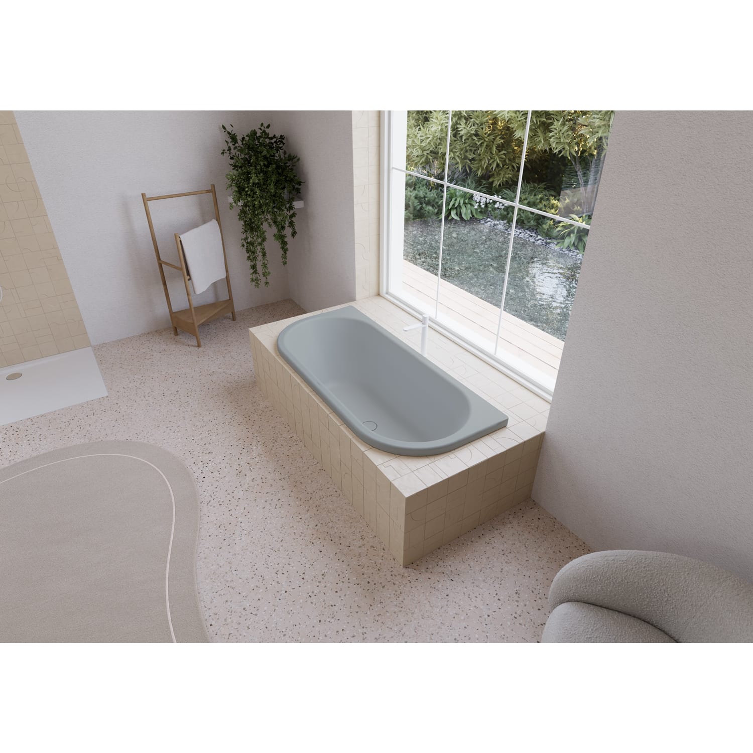- emaillierte, und in das Wannendesign integrierte Ablaufabdeckung und Überlaufknopf