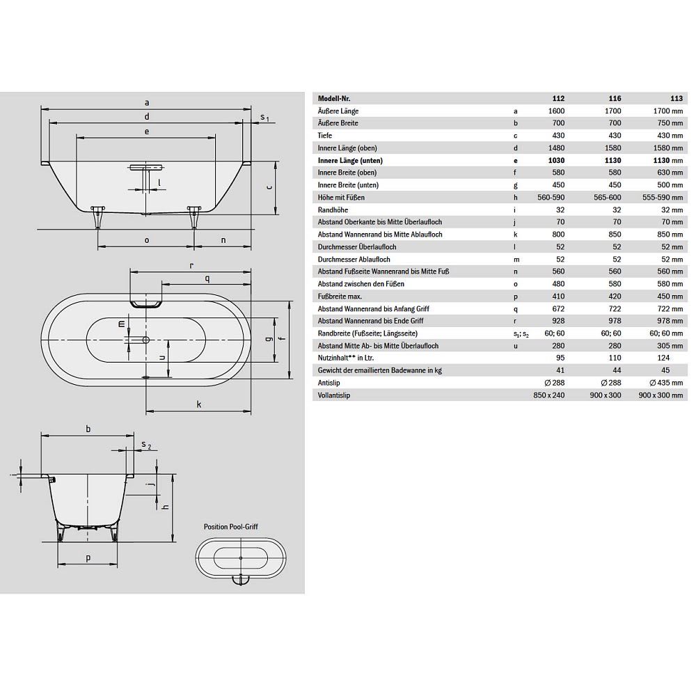 Ab- und Überlaufgarnitur in Sonderlänge erforderlich!