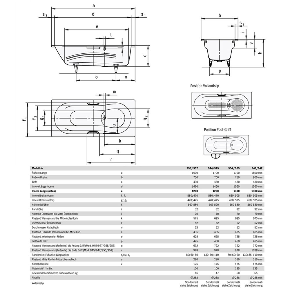 Kaldewei Vaio Set 944 Badewanne 170 x 70 cm mit Vollantislip und Überlauf gegenüberliegend