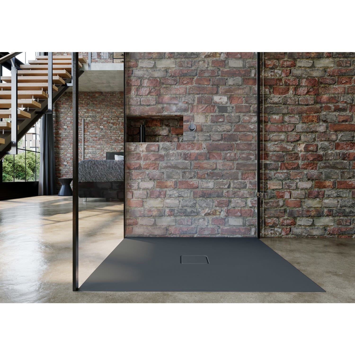 - Bodenebene Duschfläche mit zentriertem Ablauf