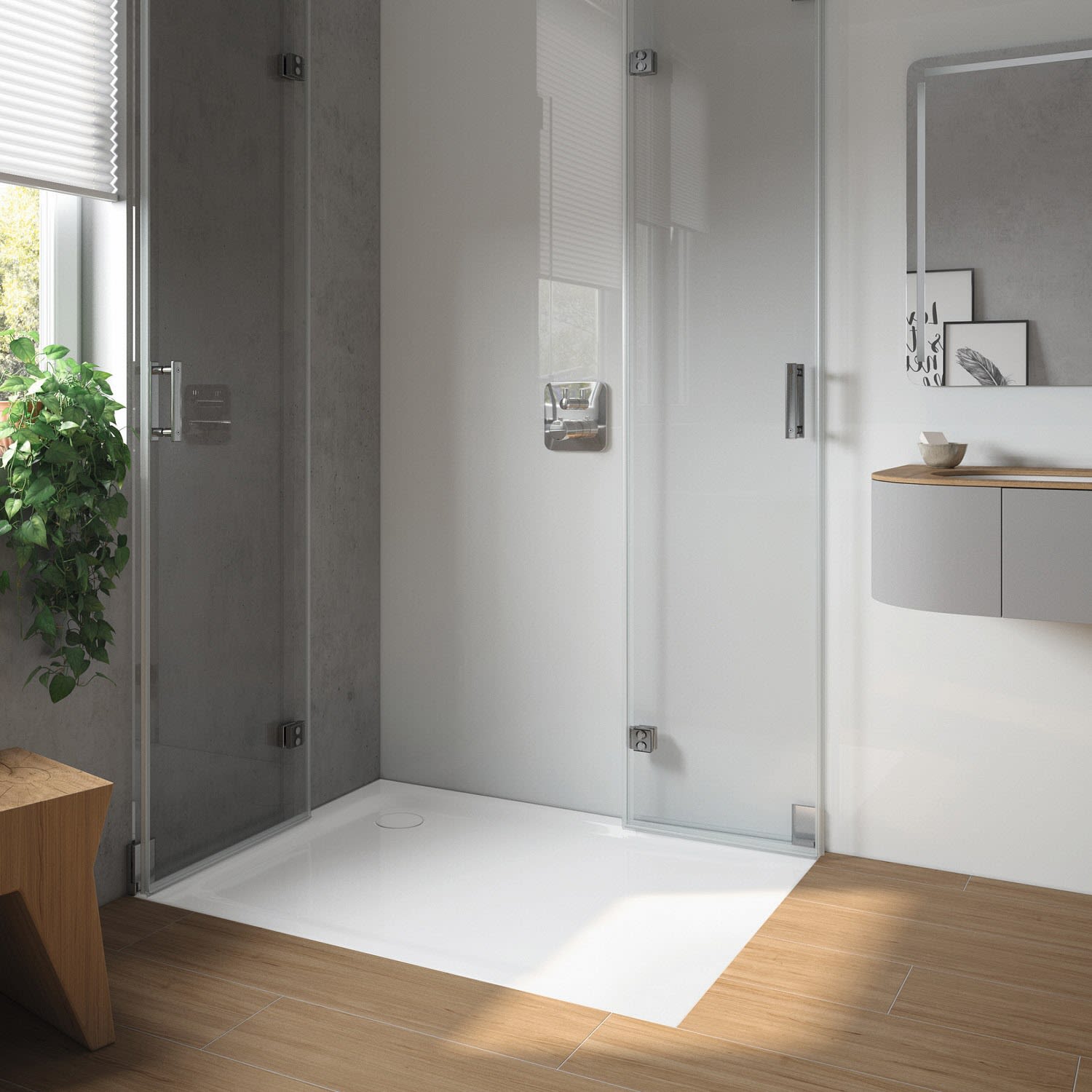 - bodenebene Duschfläche mit Eckablauf und umlaufender Prägung