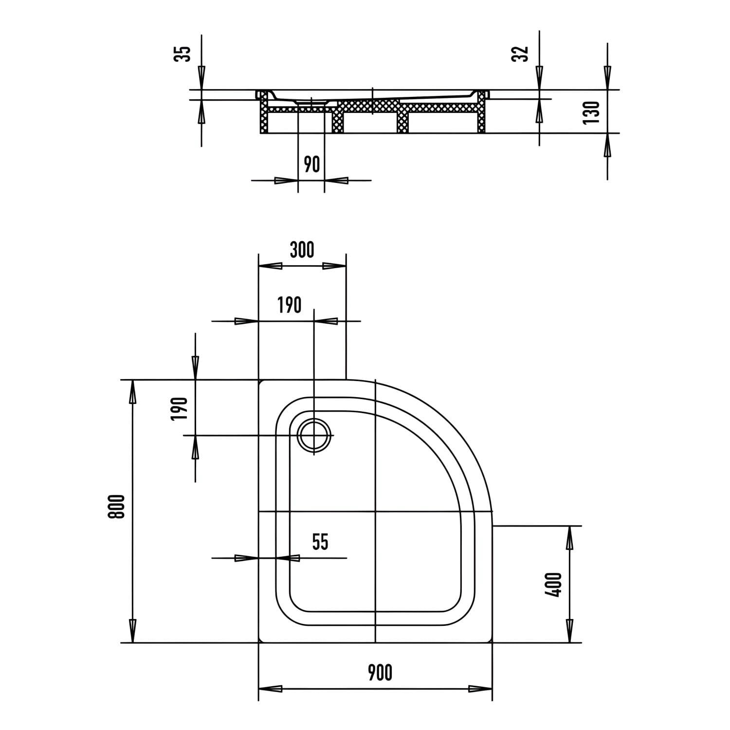 Kaldewei Zirkon 603-2 Viertelkreis-Duschwanne 90 x 80 x 3,5 cm mit Wannenträger