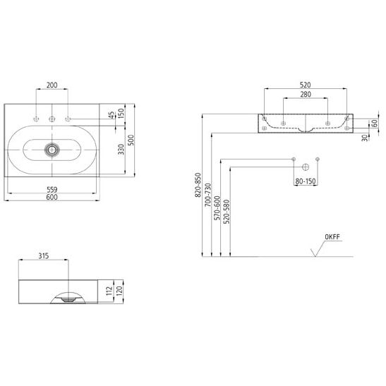 Kaldewei CENTRO Wandwaschtisch 3061 mit 3 Hahnlochbohrungen, 60 cm