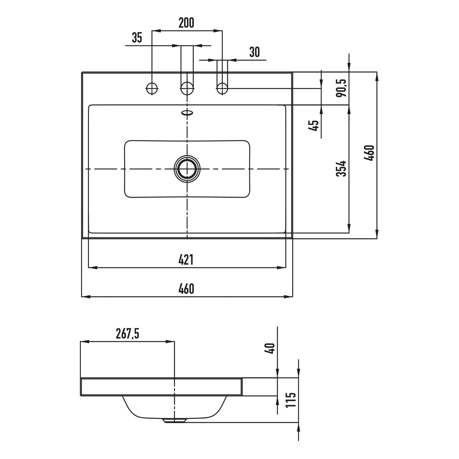 Kaldewei PURO Aufsatzwaschtisch 3153 mit 3 Hahnlochbohrungen, 46 cm