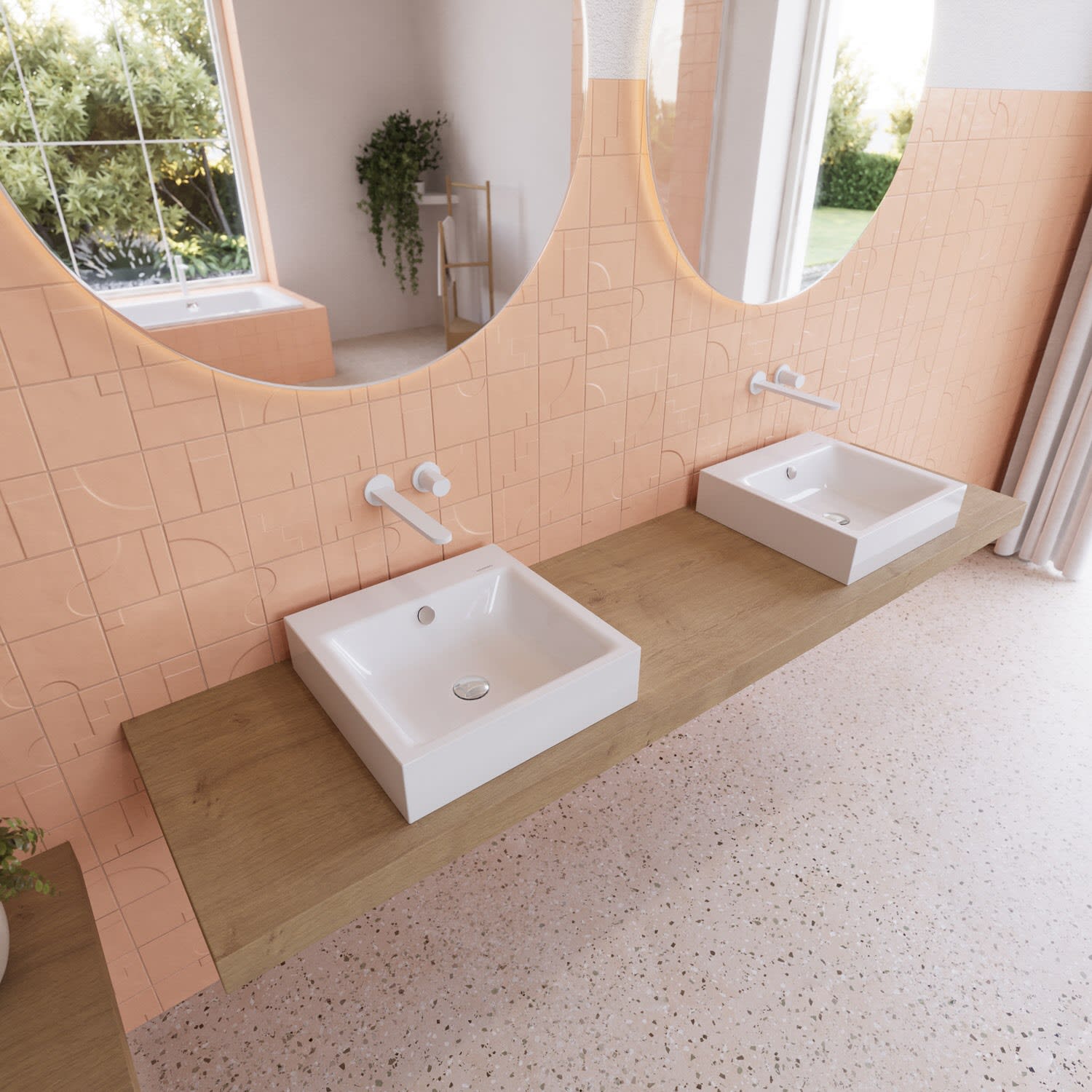 Die reduzierte, rechteckige Form, entworfen von Anke Salomon, strahlt Klarheit aus und fügt sich sowohl als Solitär auf einem hohen Möbelunterbau als auch in eine integrative Badlandschaft überzeugend ein.