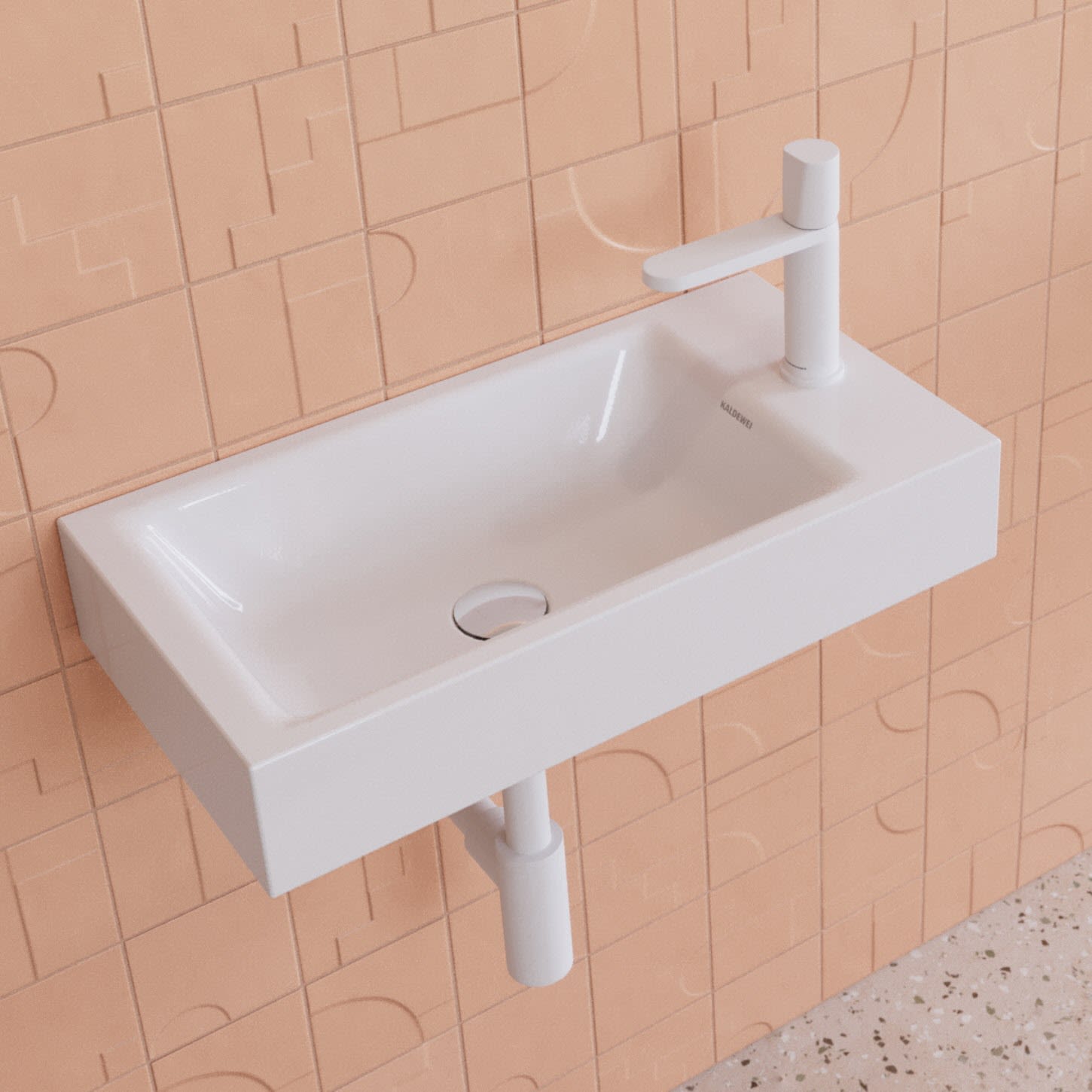 - Montage Varianten: Wand-Handwaschtisch links oder rechts – flexible Installation bei gleichbleibender Optik.