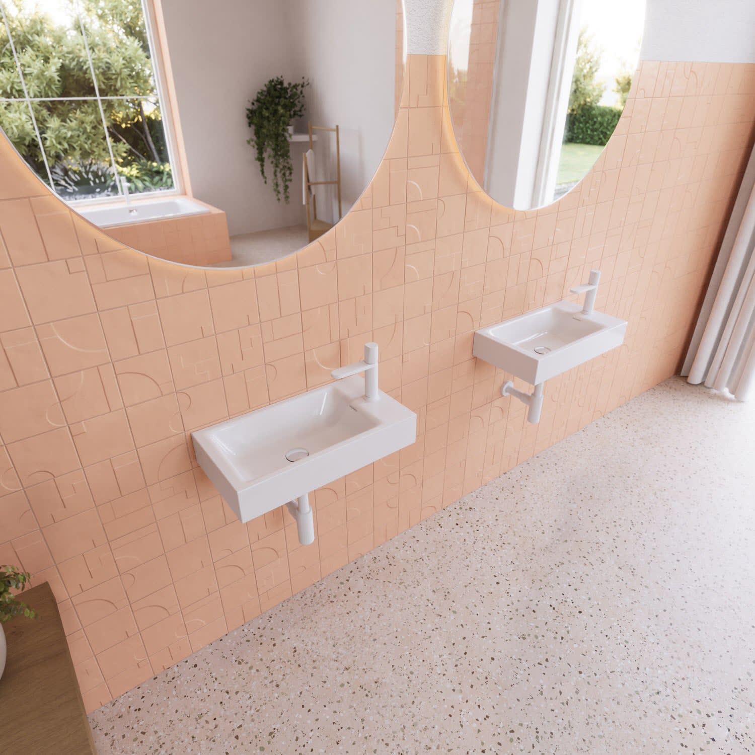 - Montage Varianten: Wand-Handwaschtisch links oder rechts – flexible Installation bei gleichbleibender Optik.