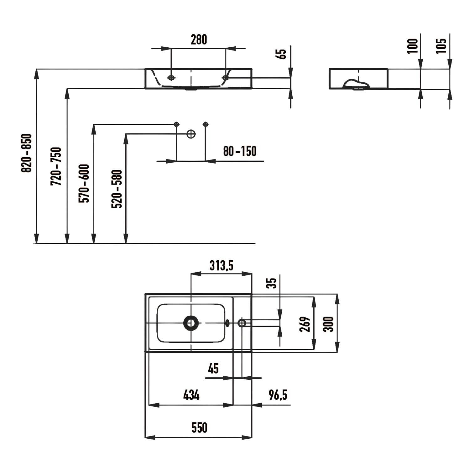 Kaldewei PURO Wand- Handwaschtisch 3162 mit 1 Hahnlochbohrung rechts, 55 cm