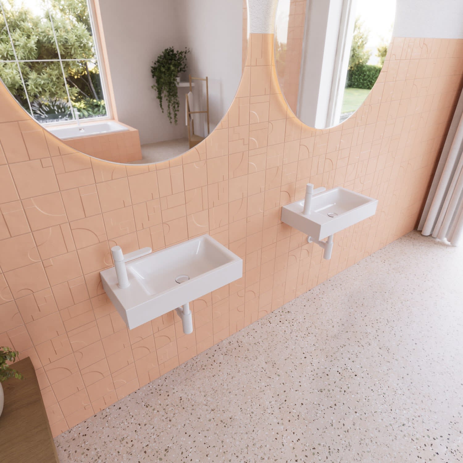 - Montage Varianten: Wand-Handwaschtisch links oder rechts – flexible Installation bei gleichbleibender Optik.
