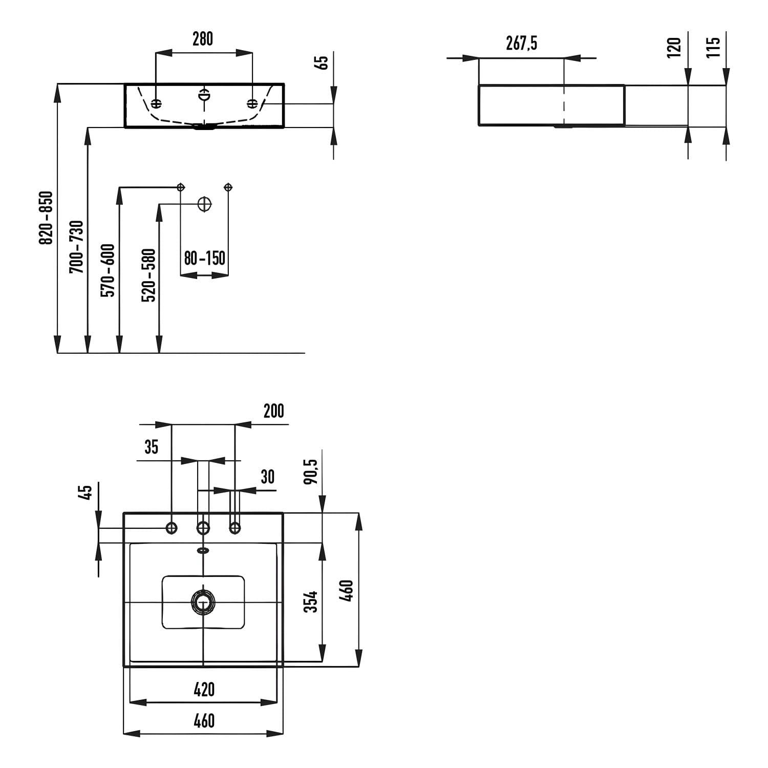 Kaldewei PURO Wandwaschtisch 3163 mit 3 Hahnlochbohrungen, 46 cm