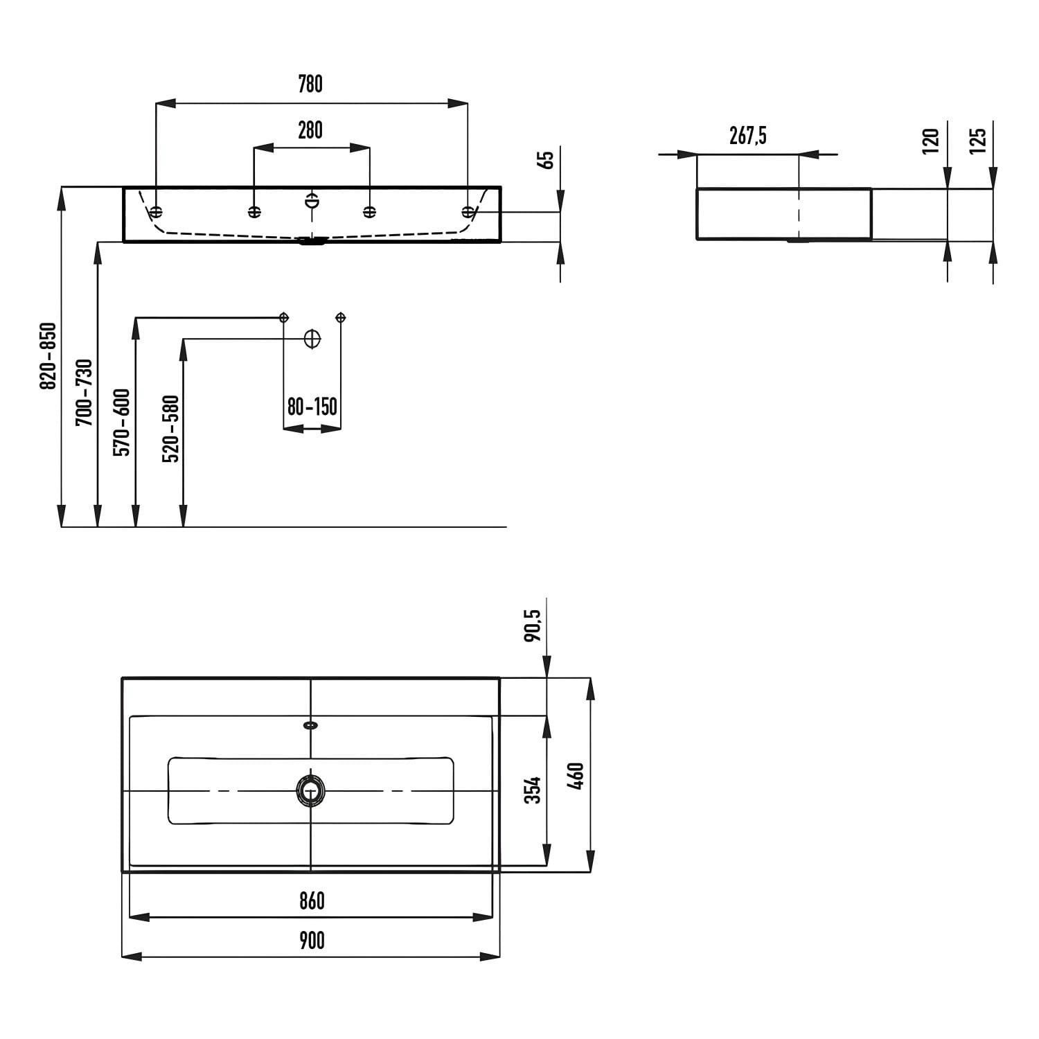 Kaldewei PURO Wandwaschtisch 3165 ohne Hahnlochbohrung, 90 cm