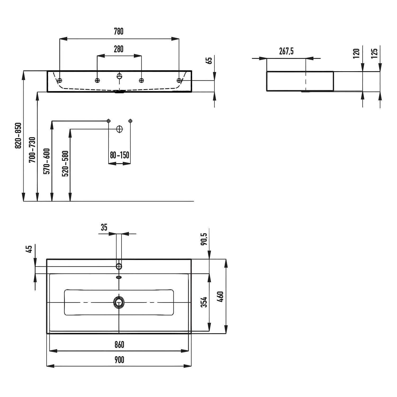 Kaldewei PURO Wandwaschtisch 3165 mit 1 Hahnlochbohrung, 90 cm