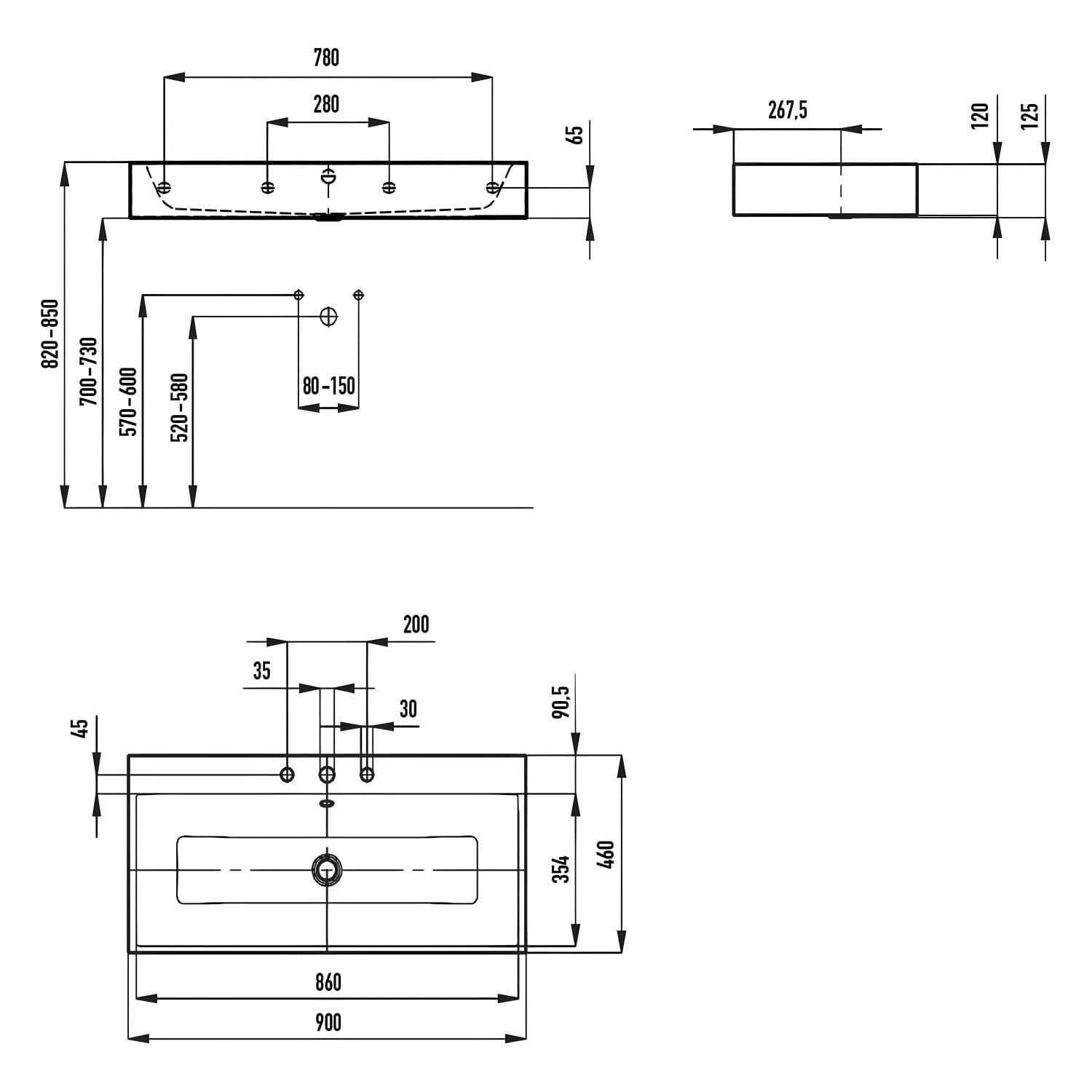 Kaldewei PURO Wandwaschtisch 3165 mit 3 Hahnlochbohrungen, 90 cm