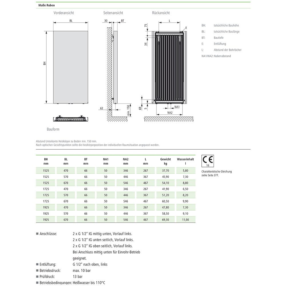 - Bei Anschluss mittig unten für Einrohr-Betrieb geeignet