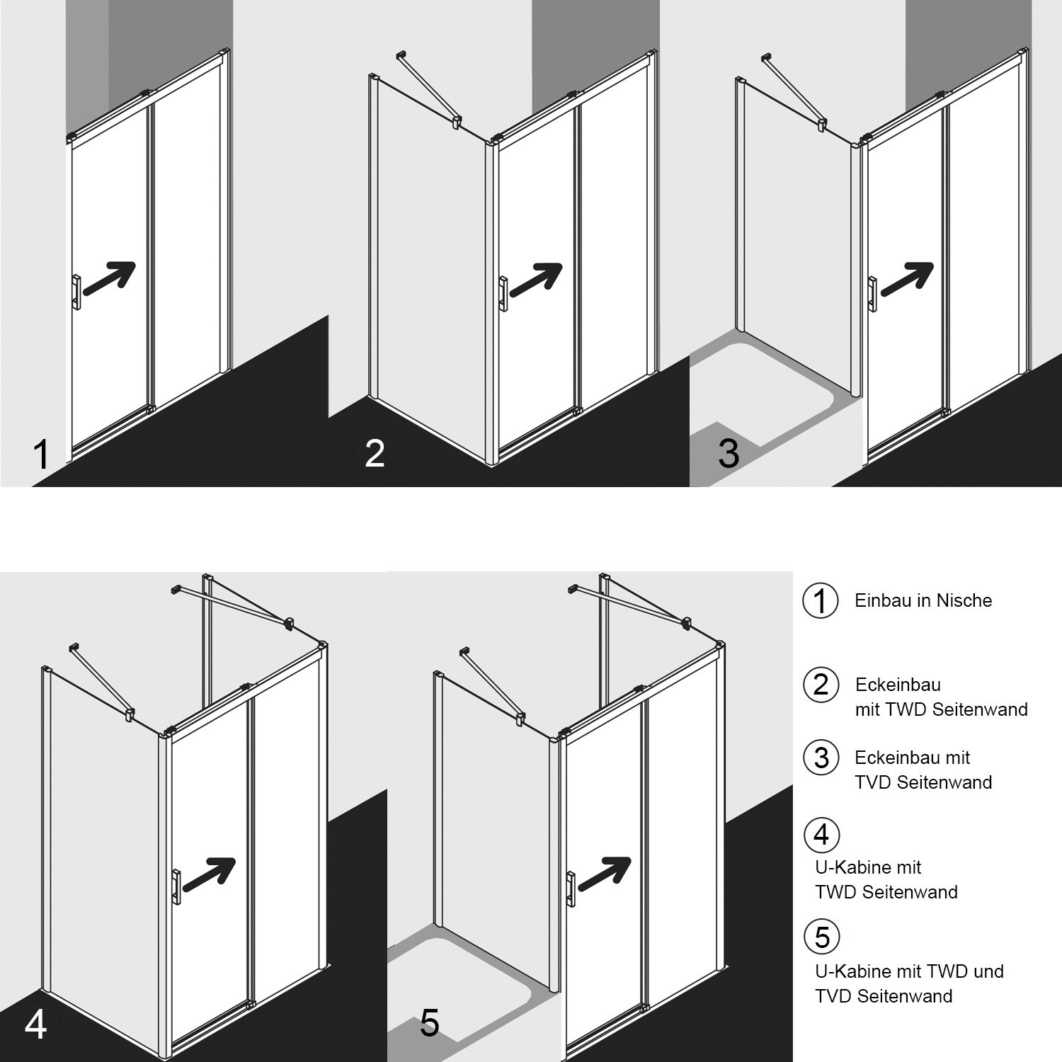 - Für eine vollständige Duschabtrennung in Kombination mit Seitenwand, wird noch eine Seitenwand bzw. verkürzte Seitenwand benötigt.