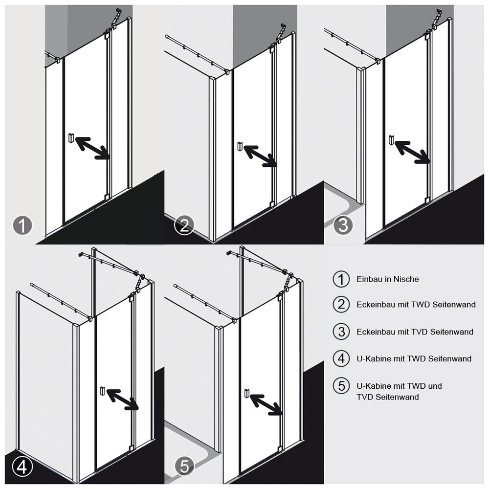 - zum Einbau in der Nische oder als Kombination mit Seitenwand RATWD oder Seitenwand auf Wanne RATVD, als Eckeinbau oder U-Kabine
