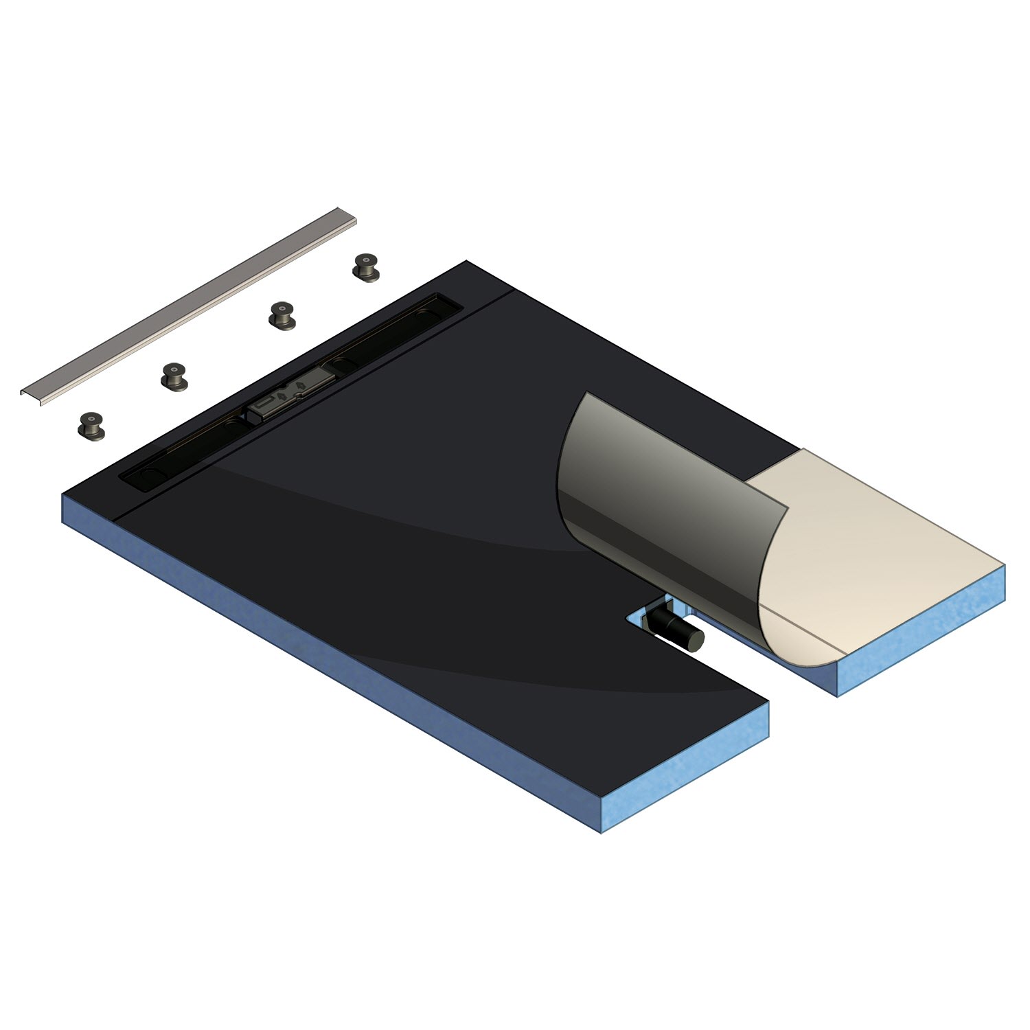 - Serienmäßig mit Rinnenabdeckung aus Edelstahl in Rinnenlänge 70 cm und Dichtecke 100 x 45 cm