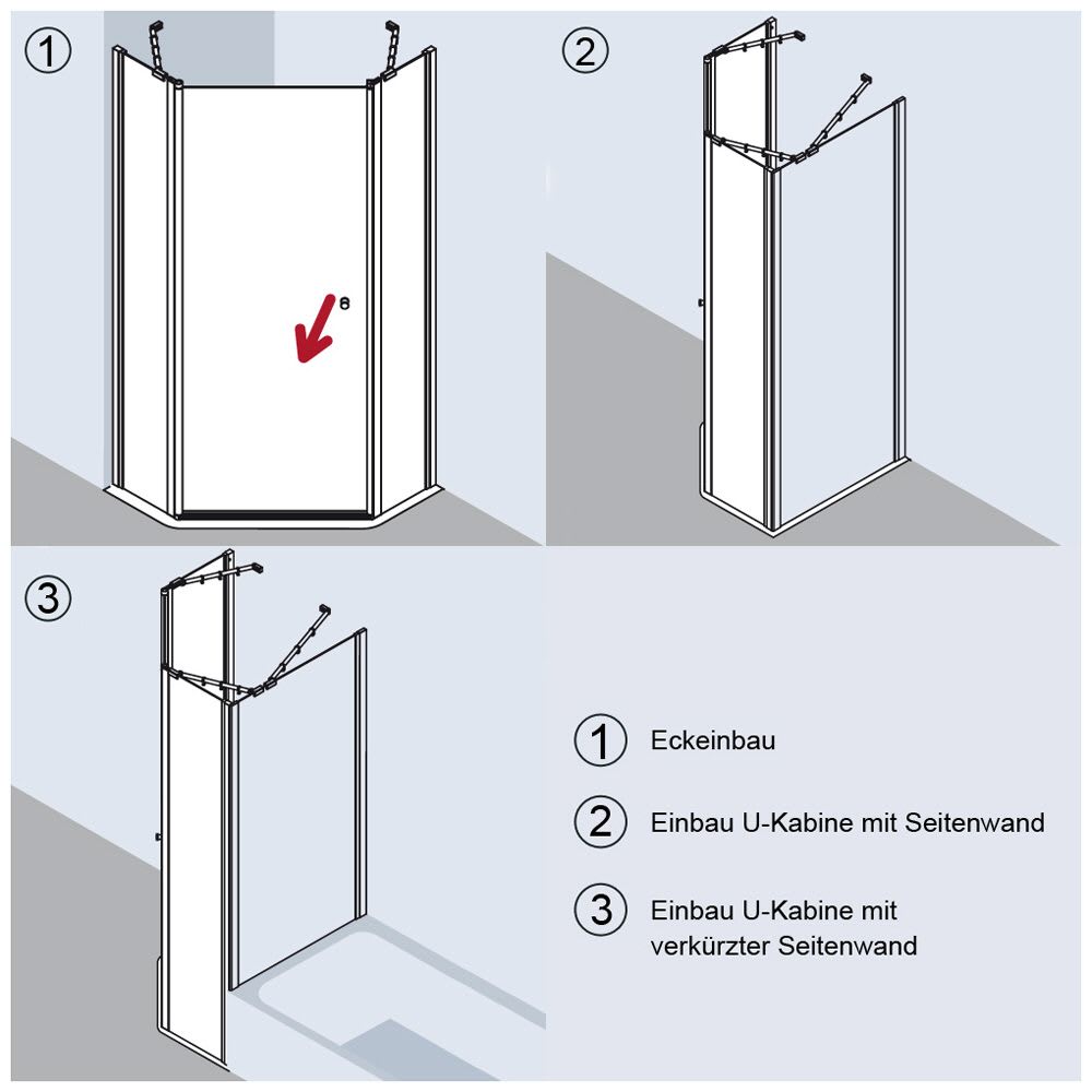 - bei Montage als U-Kabine bitte darauf achten, dass entsprechende Seitenwände separat bestellt werden müssen