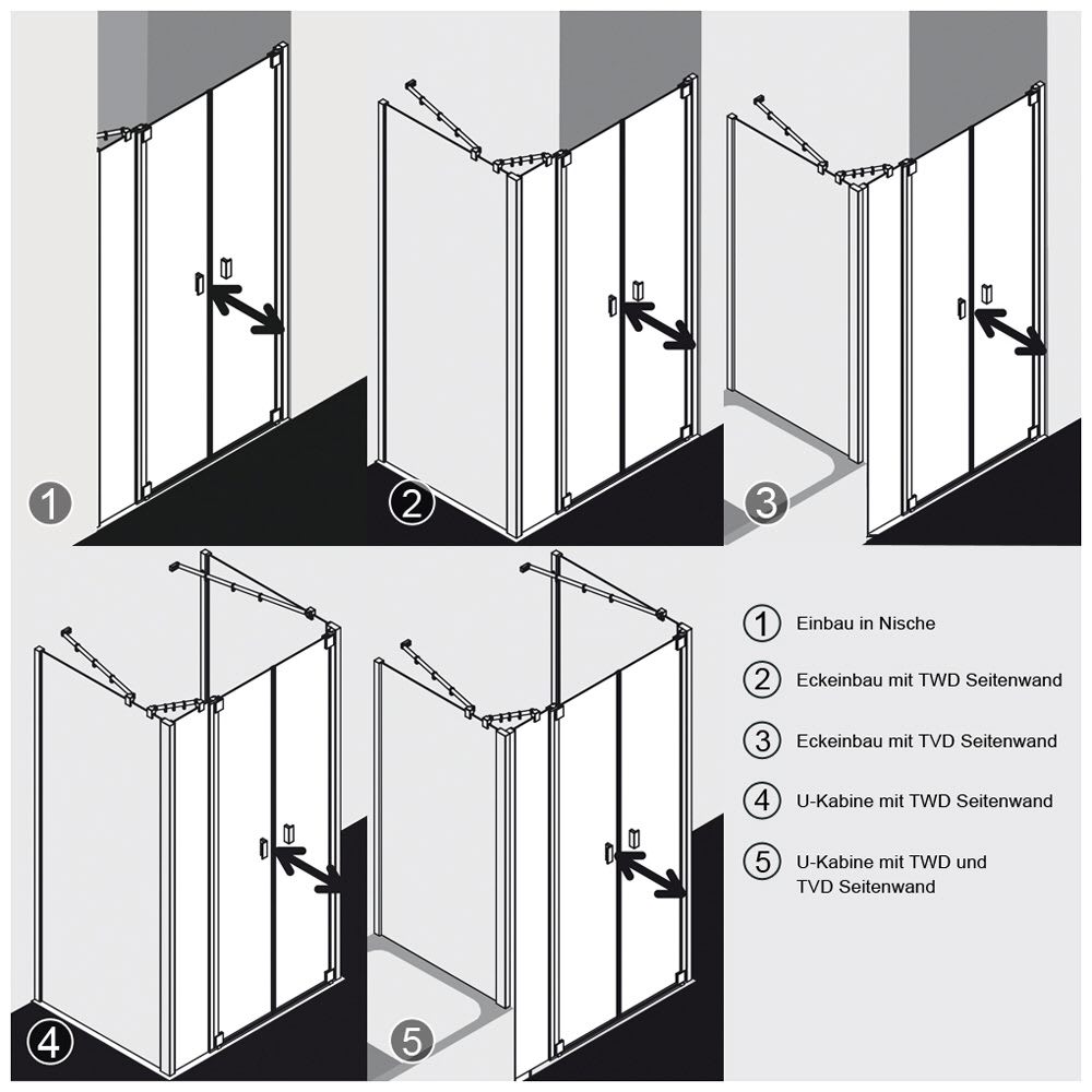 - zum Einbau in der Nische oder als Kombination mit Seitenwand RATWD oder Seitenwand auf Wanne RATVD, als Eckeinbau oder U-Kabine