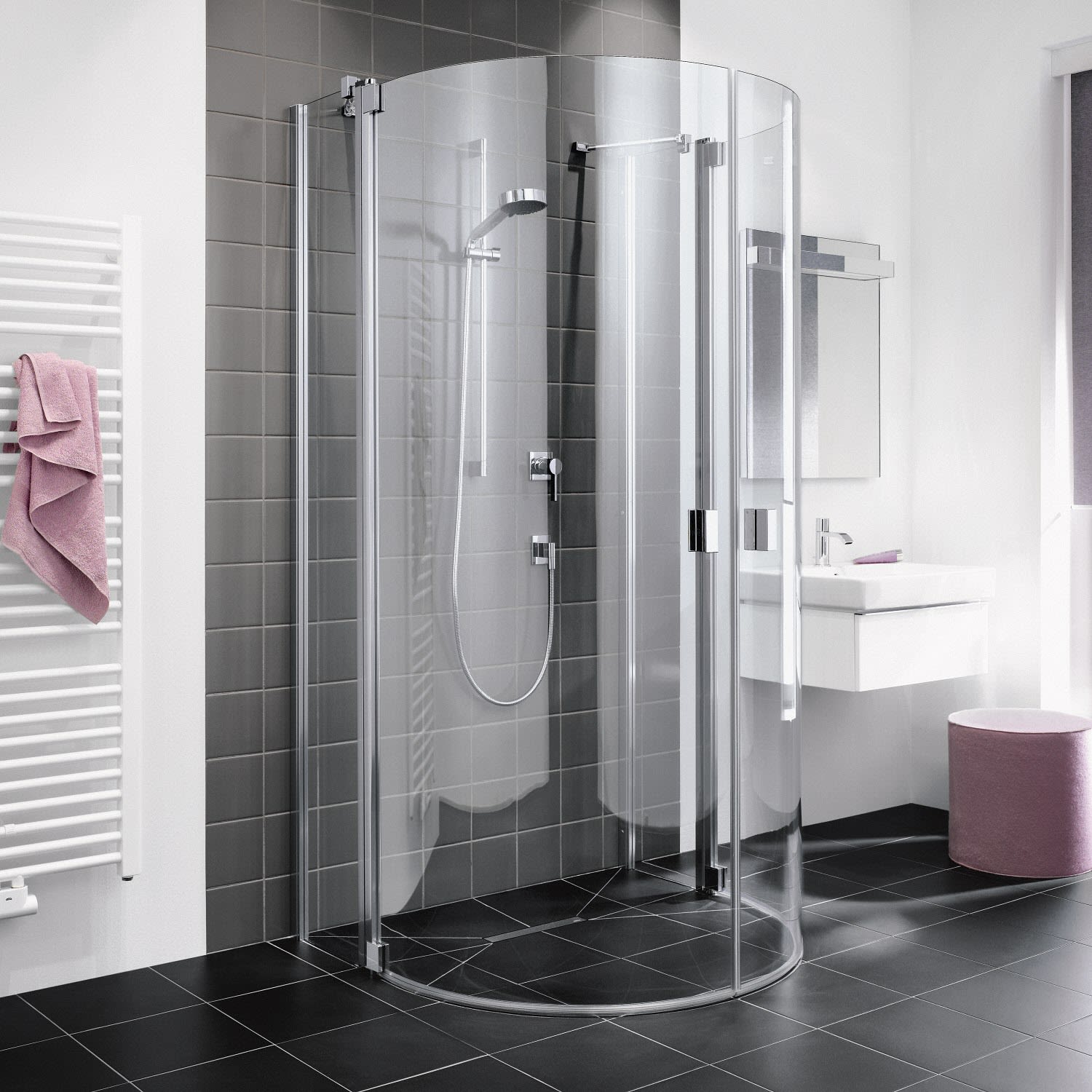 - Halbkreis-Duschkabine mit Doppel-Pendeltür und 2 Festteilen