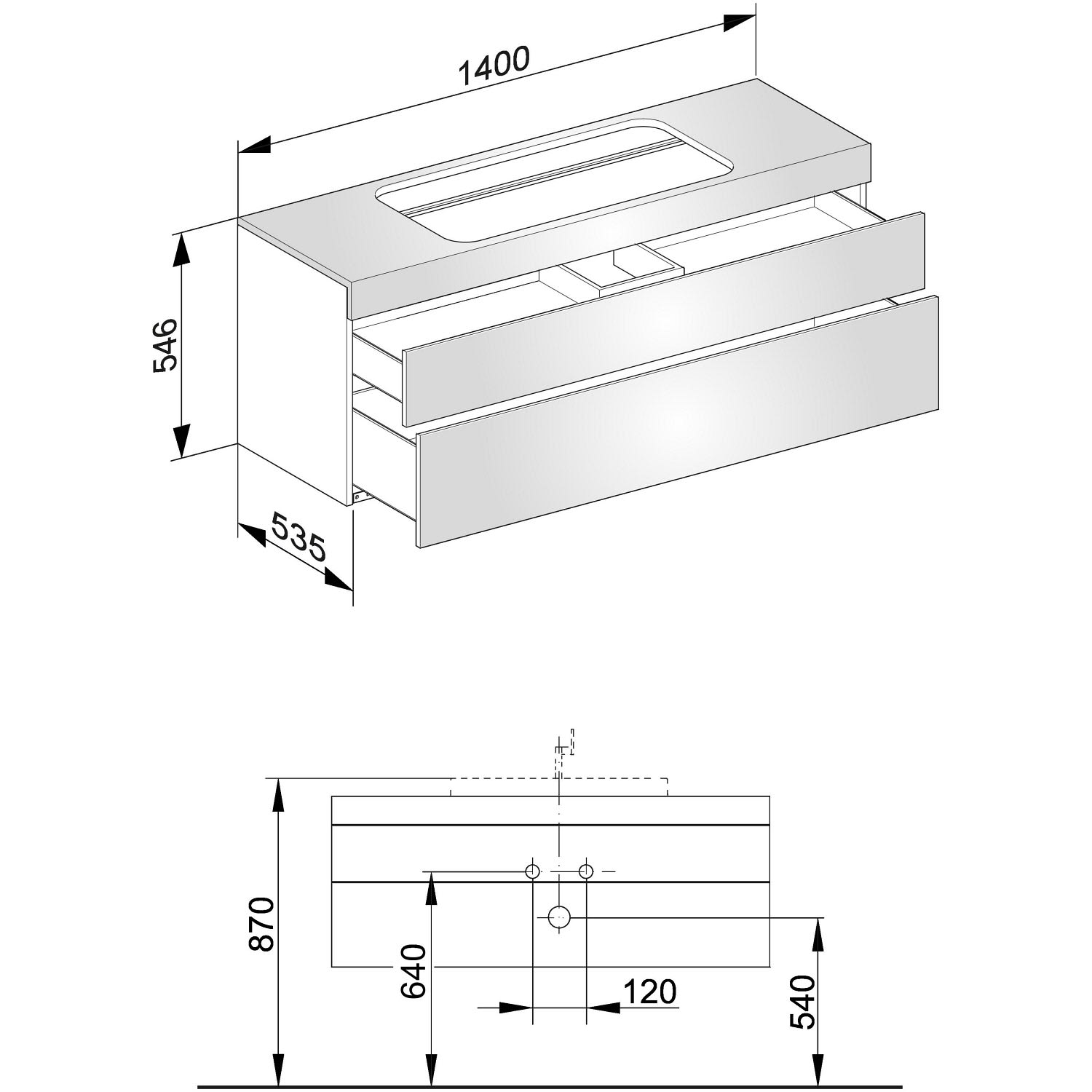 B: 140 T: 53,5 H: 54,6 cm