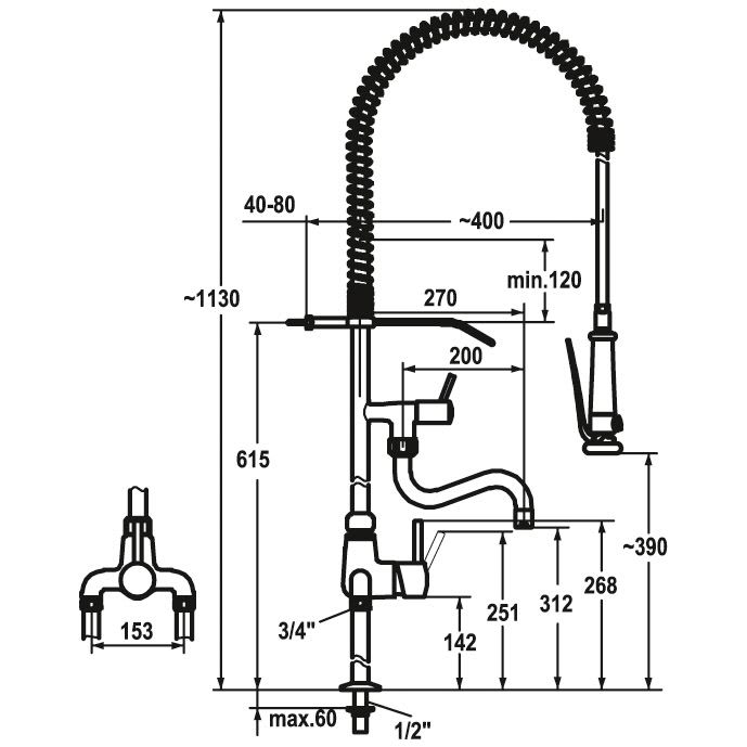 KWC Gastro Einhebel Spültisch-Zweiloch-Brückenbatterie mit Profi-Geschirrbrause für die Profiküche, Ausladung 20 cm