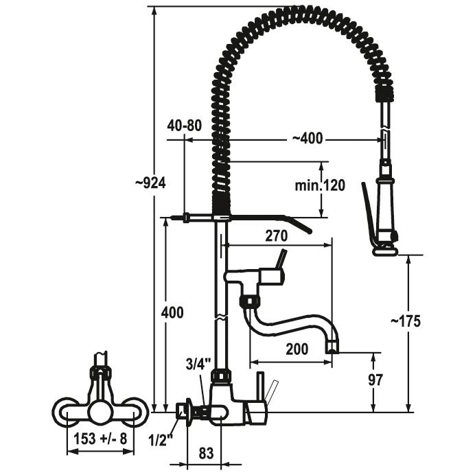 KWC Gastro Einhebel Spültisch-Wandbatterie mit Profi-Geschirrbrause für die Profiküche, Ausladung 20 cm