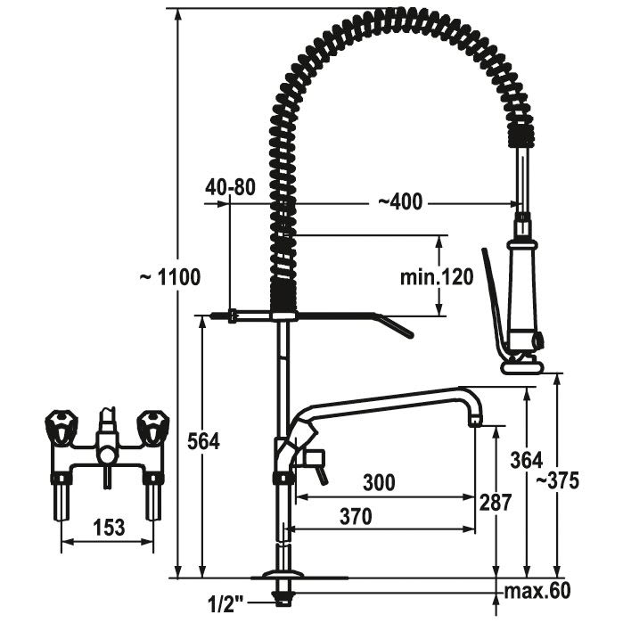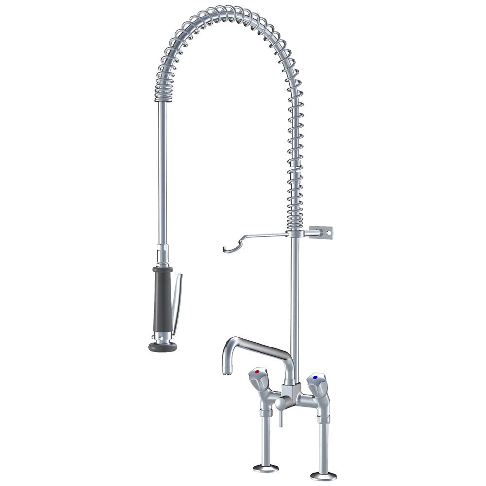 KWC Gastro Zweigriff-Spültisch-Brückenbatterie mit Geschirrwaschbrause und Schwenkauslauf für die Profiküche