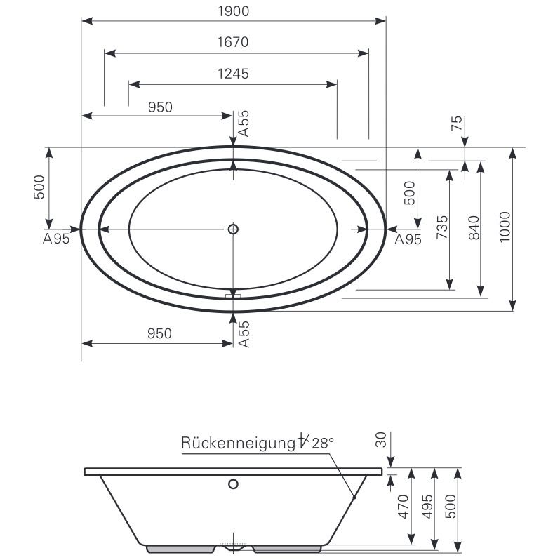 Mauersberger Oval-Badewanne Fusaca 190 x 100 cm