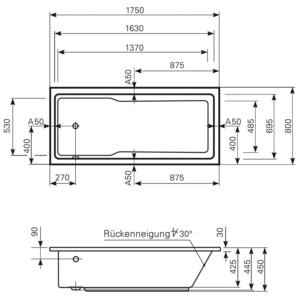Mauersberger Badewanne Jatro 175 x 80 cm Überlaufloch gegenüberliegend