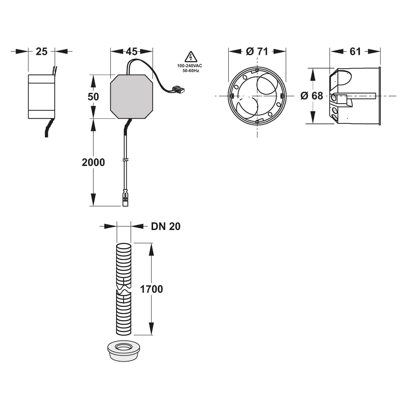 - 1 Netzgerät mit VDE-Sicherheitstransformator 230 VAC/24 VDC, mit Anschlusskabel 2000 mm Länge, für Anschluss an WC-Elektronik